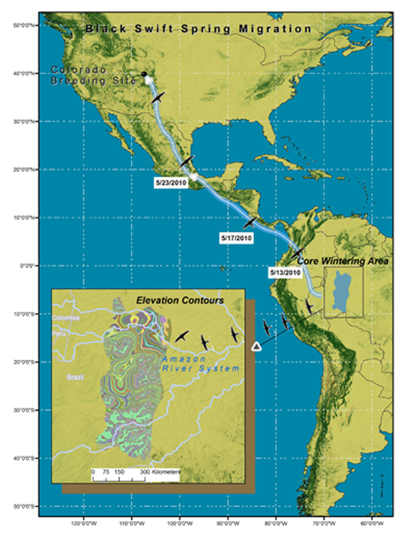 Дзякуючы геалакатарам, якія рэгіструюць штодзень час усходу і заходу сонца ў месцы знаходжання, можна вызначыць геаграфічныя каардынаты гэтага месца. Такія прылады былі прымацаваныя на спіны чатырох дарослых паўночных чорных свіргулёў. Птушкі гнездавалі ў двух розных месцах у Каларада і праз год былі адлоўлены ізноў, каб сцягнуць з іх запісаныя геалакатарамі дадзеныя. Атрымалася злапаць трох з чатырох свіргулёў, аднак гэта было зусім нялёгка зрабіць, бо птушкі гэтыя гняздуюць у глыбокіх нішах за водаспадамі, якія сцякаюць у рознай глыбіні каньёны. Па атрыманых дадзеных, птушкі вырушылі на поўдзень паміж 10 і 19 верасня, а ў Бразілію прыляцелі ўжо паміж 28 верасня і 12 кастрычніка. Ў адваротны шлях свіргулі вырушылі паміж 23 мая і 18 чэрвеня.
