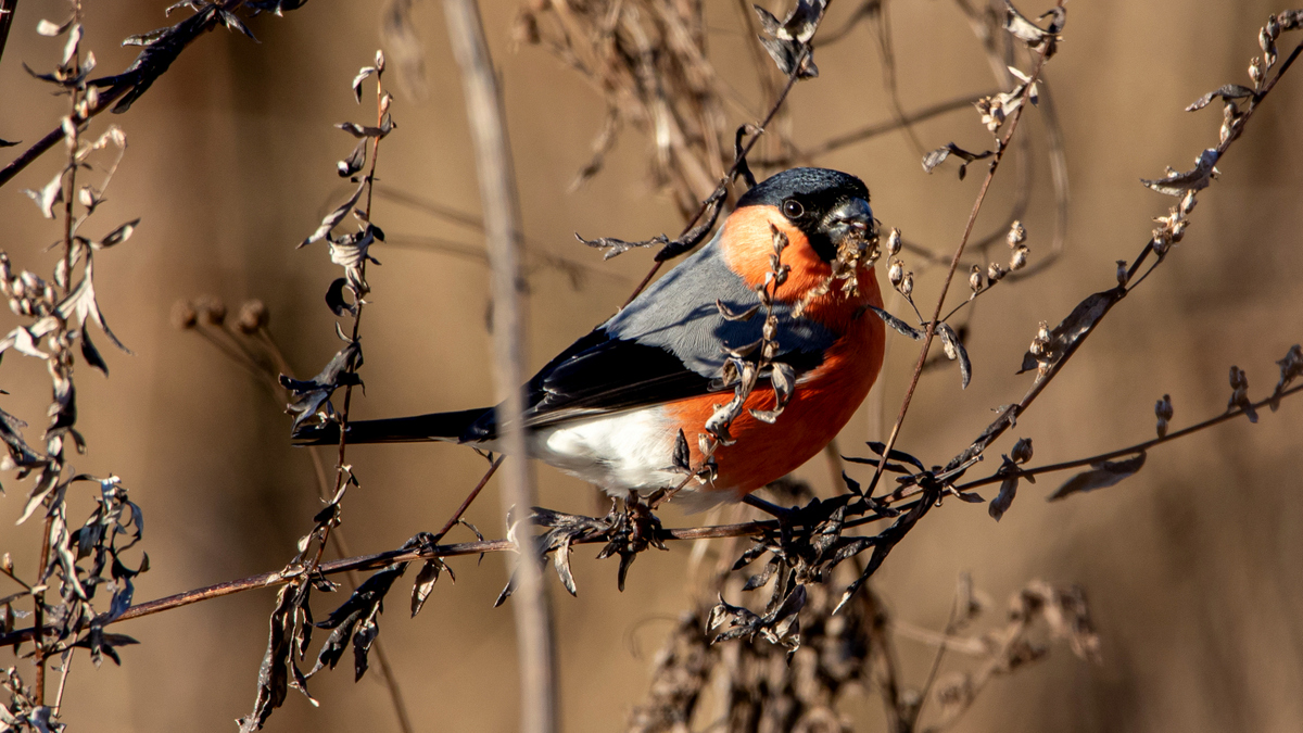 В середине декабря у снегирей еще богатый выбор кормов. А эта пара снегирей предпочла довольно необычное меню - семена чернобыльника. 13.12.2025, Могилевский район.