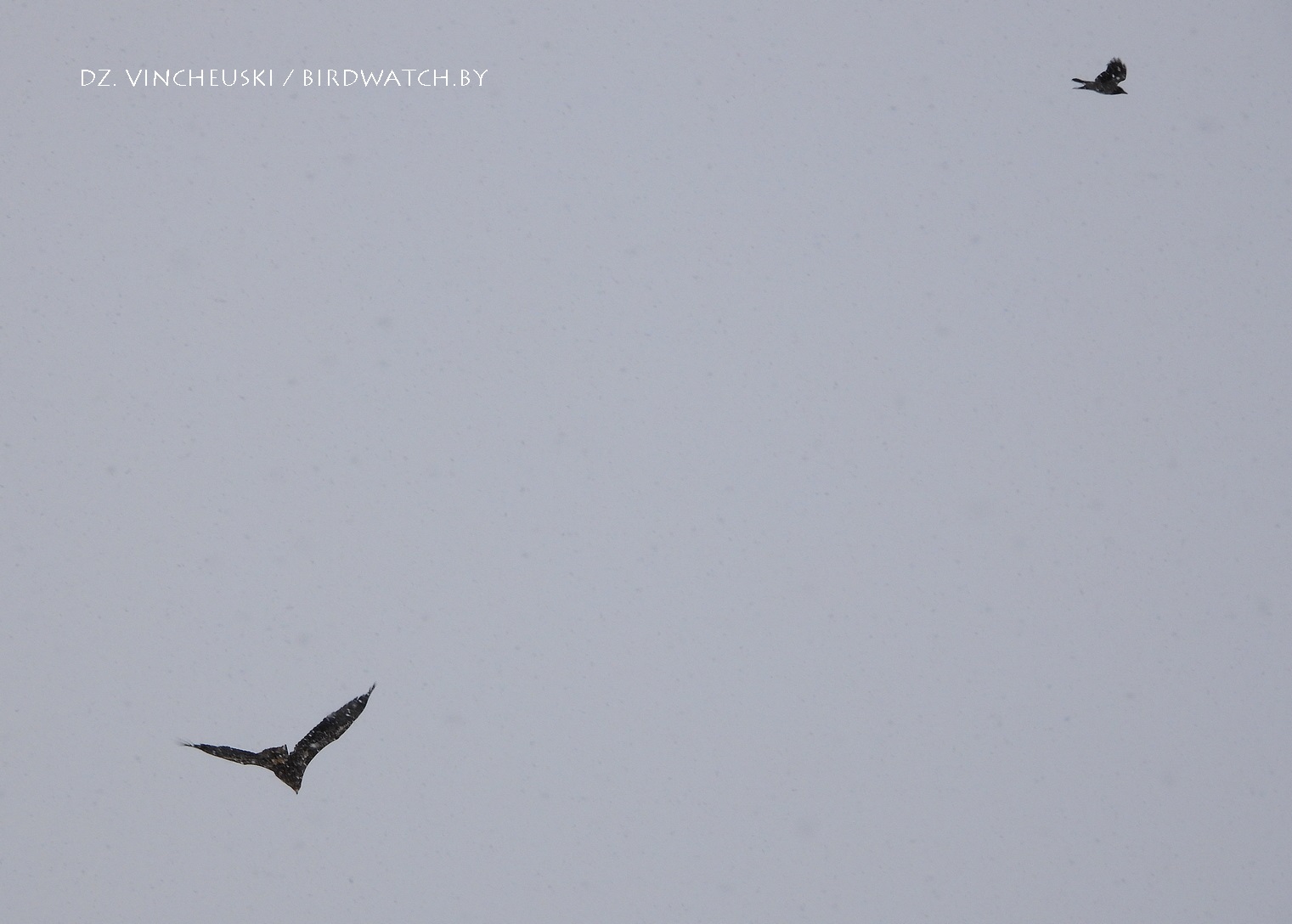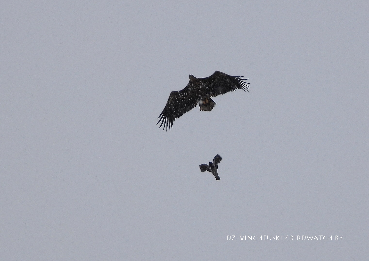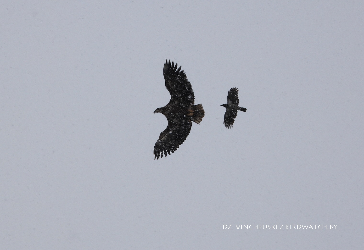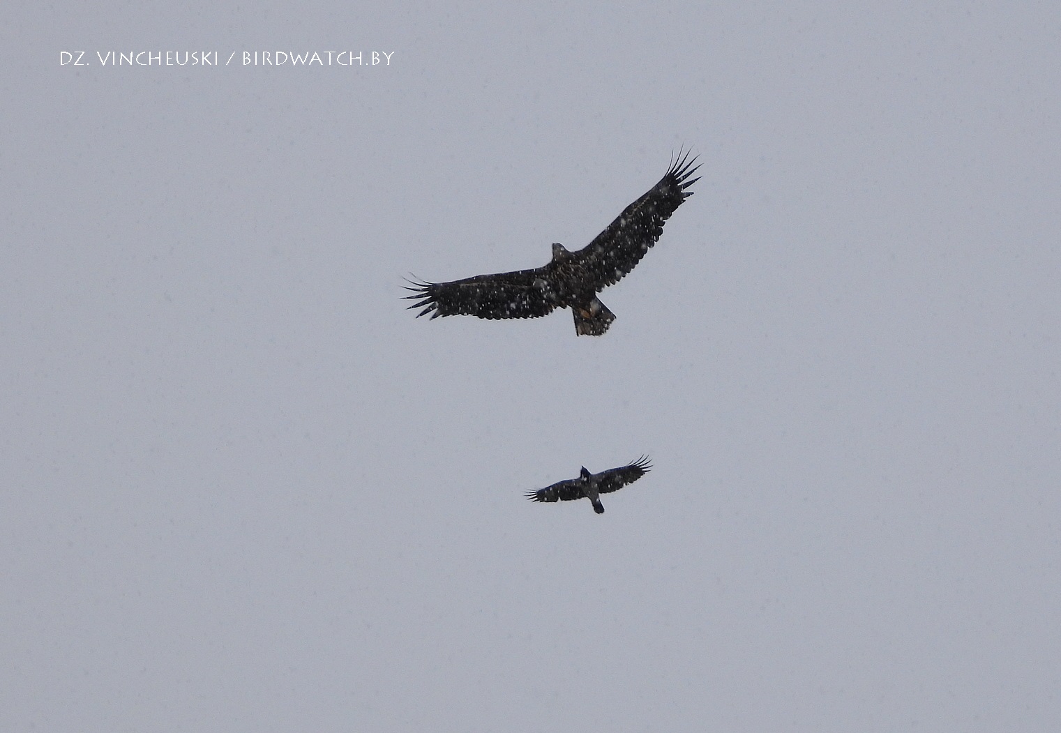 Я здагадаўся, што ў іх была важкая прычына адляцець адтуль, бо з некага боку яўна набліжаецца небяспечны для іх драпежнік, якога я ўжо бачыў над Нёманам у пачатку студзеня - арлан-белахвост (Haliaetus albicilla). І я не памыліўся - малады арлан ляцеў уверх па плыні ракі - і значыць у мой бок і набліжаўся - ужо праз некалькі секунд. Але, як хутка аказалася, не сам. Бо не ўсе птушкі яго баяліся і разляталіся хто куды. З-за таго, што арлан ляцеў параўнальна павольна - яўна не спяшаўся, на невялікай адлегласці, максімум у 2 метры за ім і таксама без напругі, ляцела шэрая варона (Corvus corone cornix)!