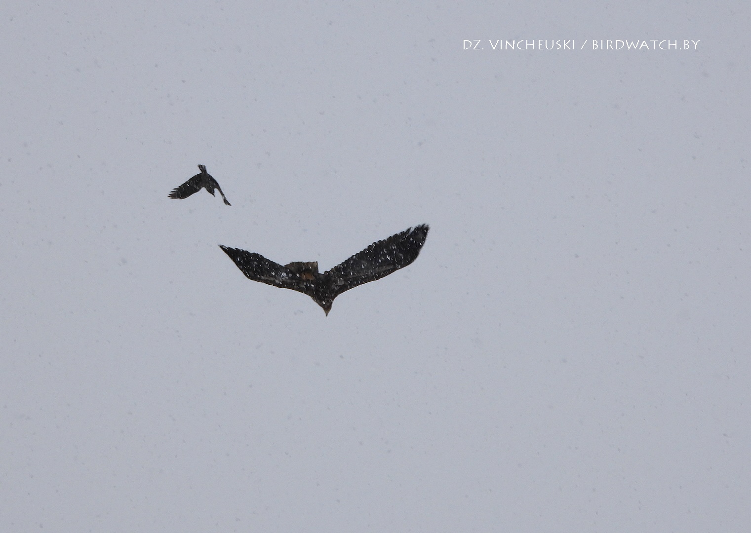 Калі б арлан раптоўна застыў на месцы нават на долі секунды, наўрацці варона паспела б адрэагаваць і адвярнуць у бок) Але гэтага не здарылася. А яшчэ праз некалькі секунд арлан паляцеў далей самотны - вароне або надакучыла гэтая небяспечная гульня, або яна ўбачыла патэнцыйную ежу і вырашыла заняцца больш важнай справай.