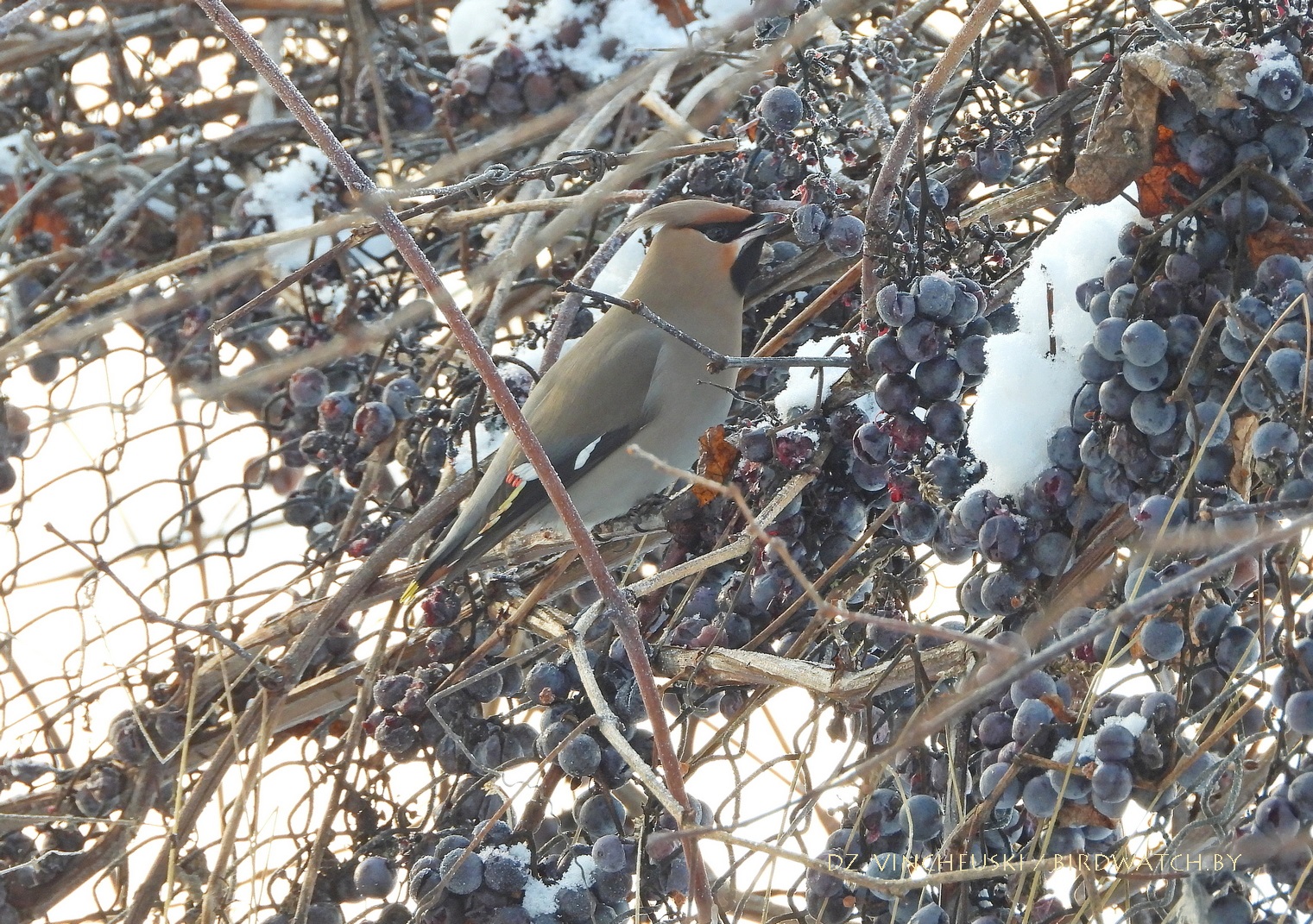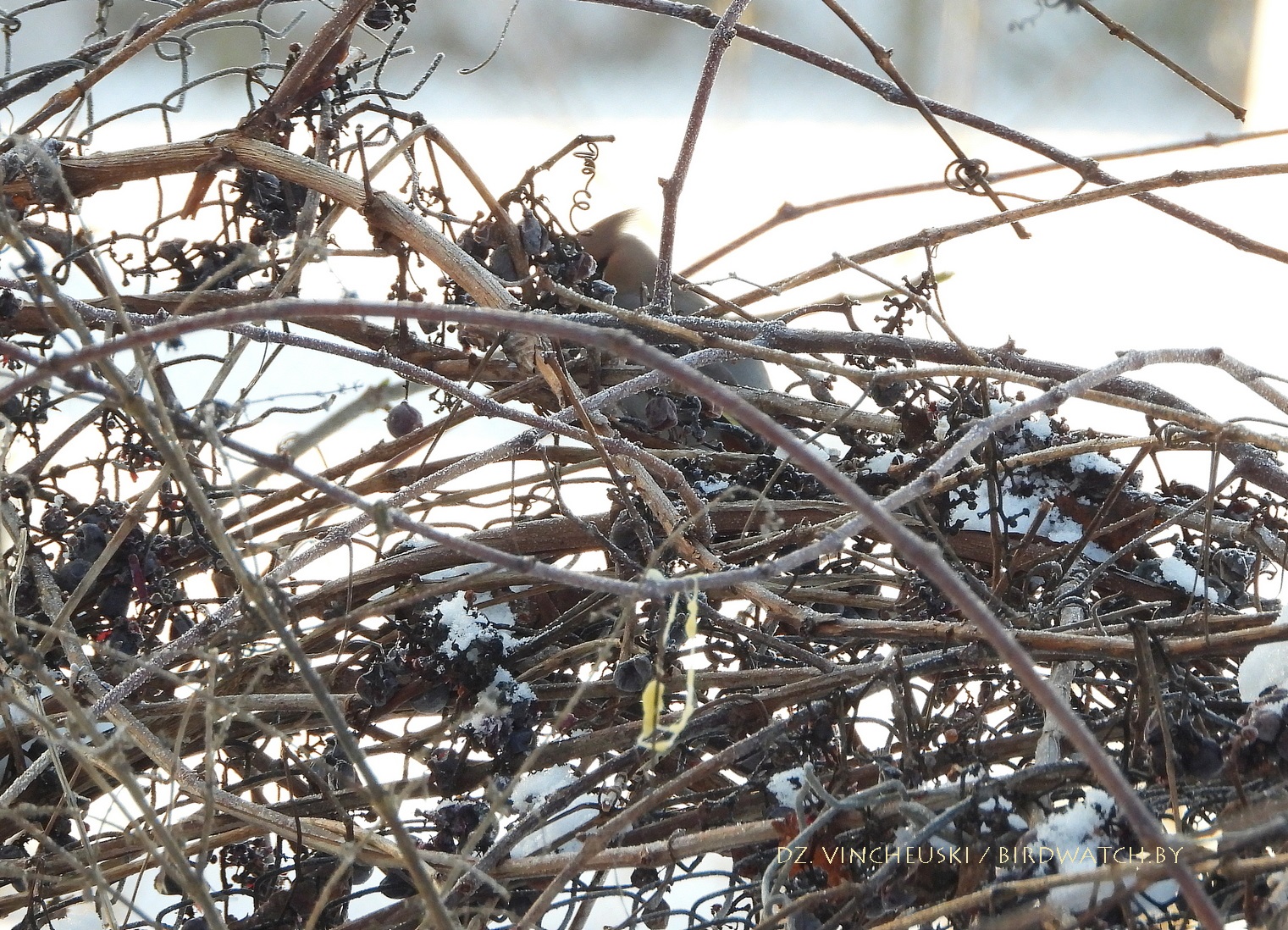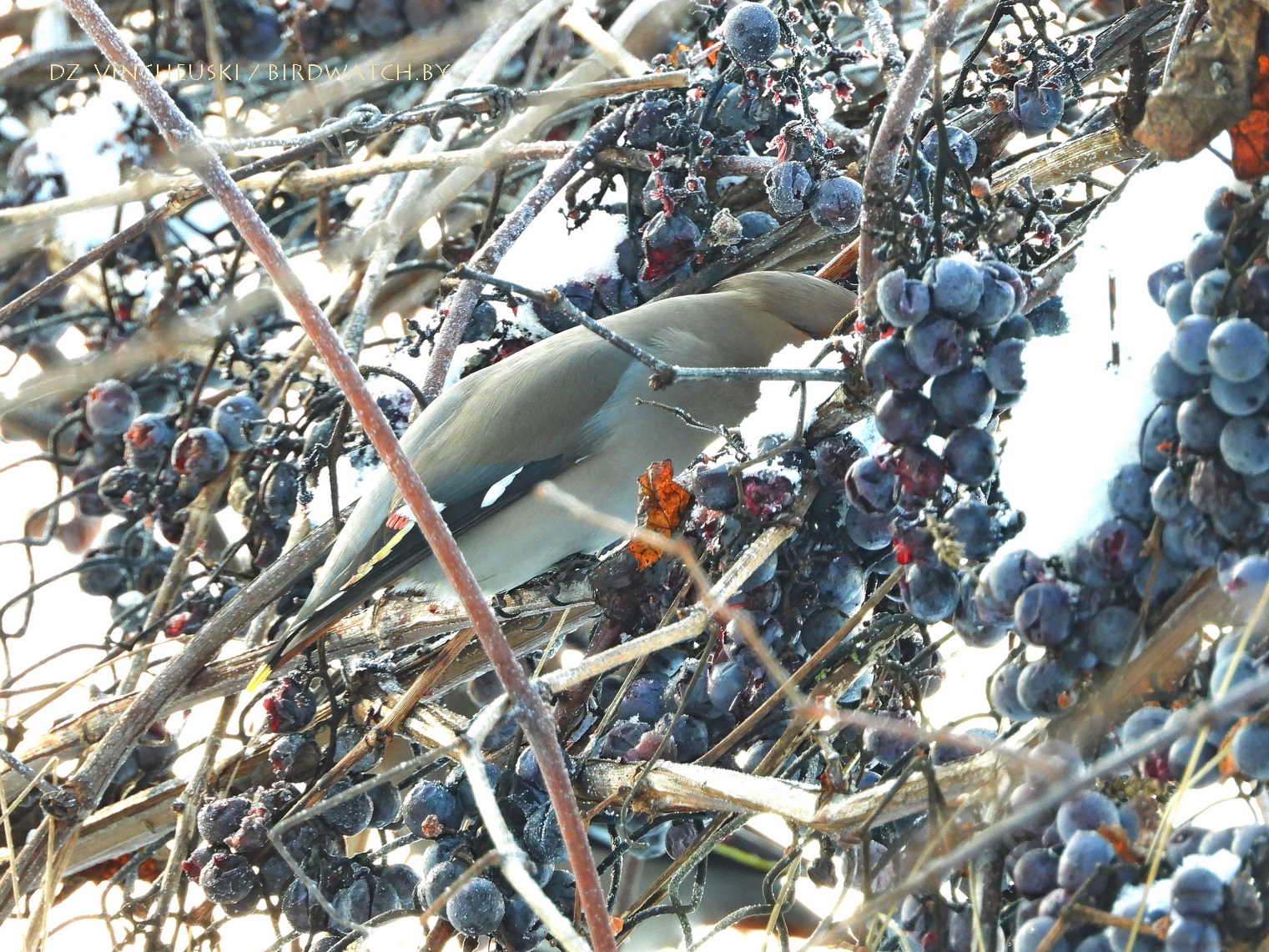 Сонечнай і марознай раніцай мы завярнулі пад будынак былой сінагогі ў Індуры каб праверыць ці засталіся там побач зімаваць кольчатыя туркаўкі, ажно амаль насупраць, на прыватным падворку за домам убачылі некалькі амялушак (Bombycilla garrulus). Яны сядзелі на старой яблыні і частка адпачывала, а частка спрабавала дзяўбсці згнілыя і прамёрзлыя яблыкі. Было далекавата для добрых здымкаў, але хутка птушкі паказалі нам, што яны могуць падляцець і значна бліжэй. Аднак не проста так, а каб пад'есці вінаграду - прыгожыя і амаль без сапсаваных ягад цёмныя гронкі звісалі невысока з сеткі, якая адгарожвала ўласна падворак ад гароду за ім. Адарваць ягаду аказалася для амялушак нескладана, а вось праглынуць - іншая справа:
