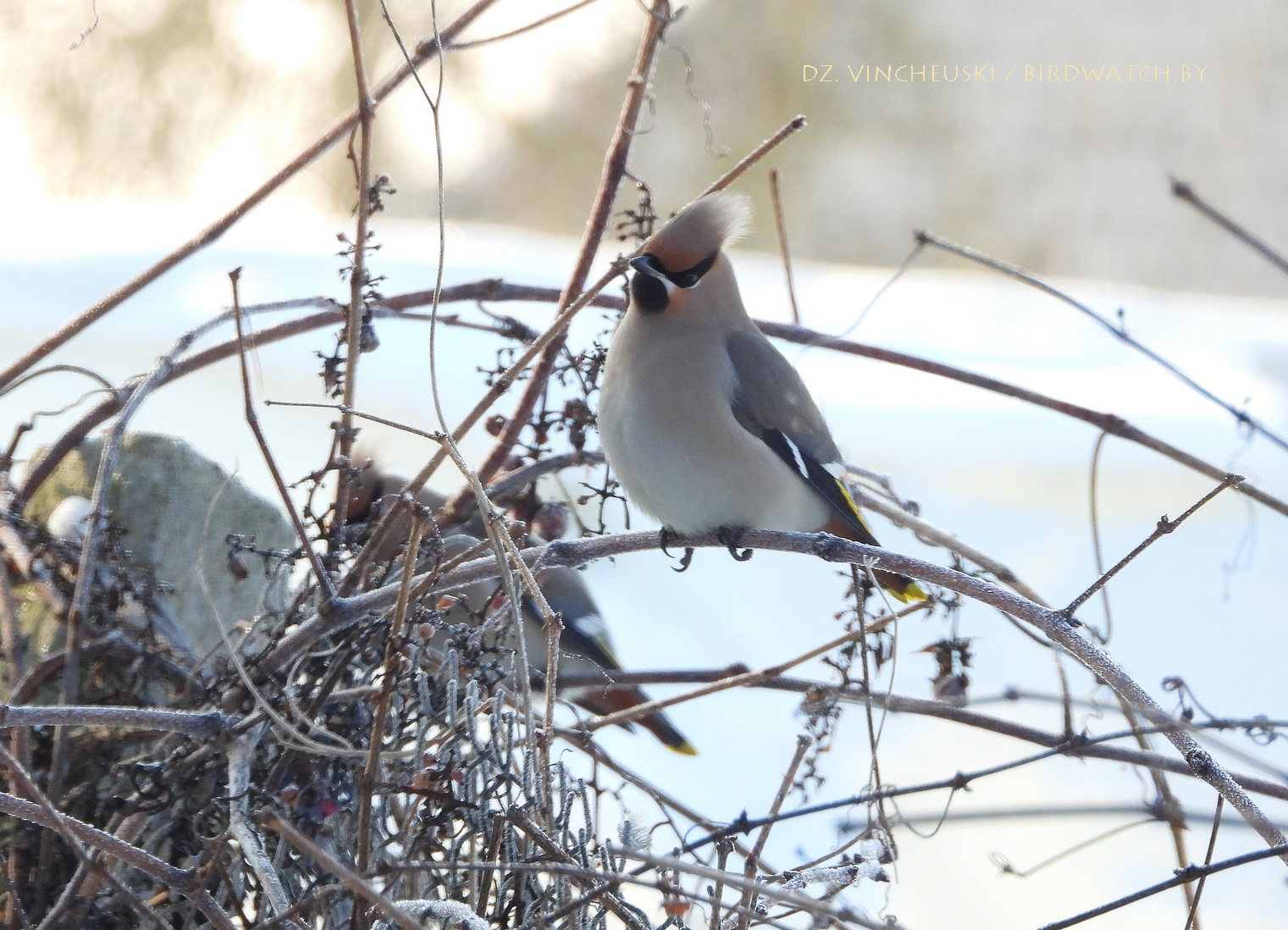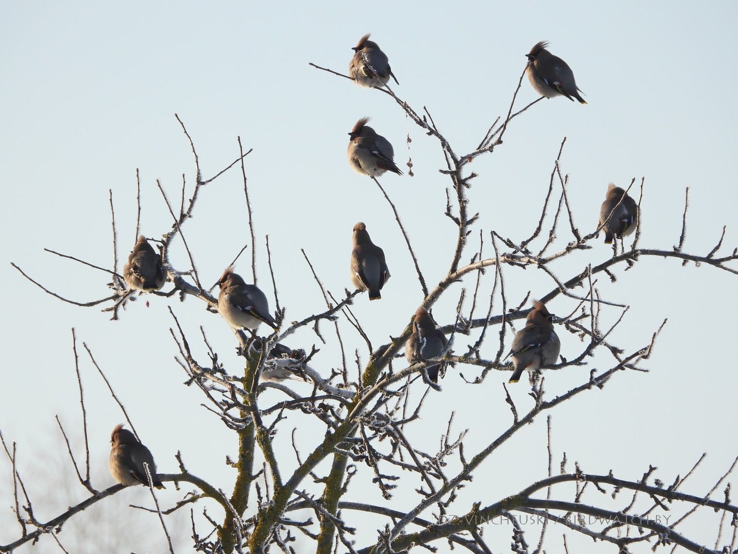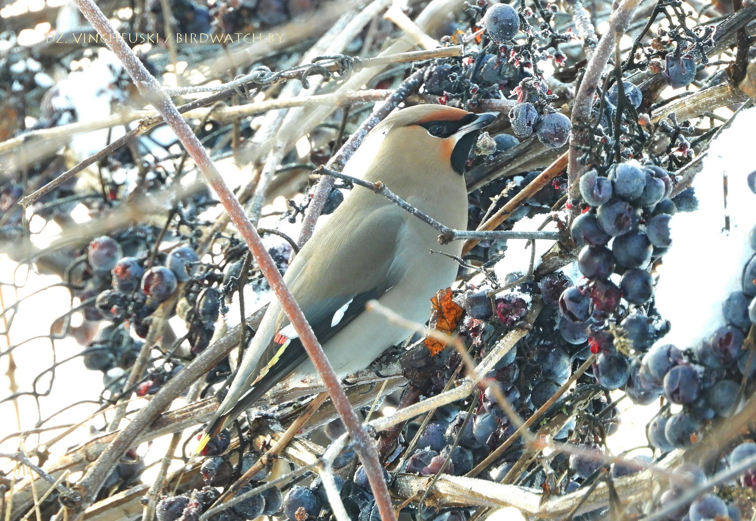 Сонечнай і марознай раніцай мы завярнулі пад будынак былой сінагогі ў Індуры каб праверыць ці засталіся там побач зімаваць кольчатыя туркаўкі, ажно амаль насупраць, на прыватным падворку за домам убачылі некалькі амялушак (Bombycilla garrulus). Яны сядзелі на старой яблыні і частка адпачывала, а частка спрабавала дзяўбсці згнілыя і прамёрзлыя яблыкі. Было далекавата для добрых здымкаў, але хутка птушкі паказалі нам, што яны могуць падляцець і значна бліжэй. Аднак не проста так, а каб пад'есці вінаграду - прыгожыя і амаль без сапсаваных ягад цёмныя гронкі звісалі невысока з сеткі, якая адгарожвала ўласна падворак ад гароду за ім. Адарваць ягаду аказалася для амялушак нескладана, а вось праглынуць - іншая справа: