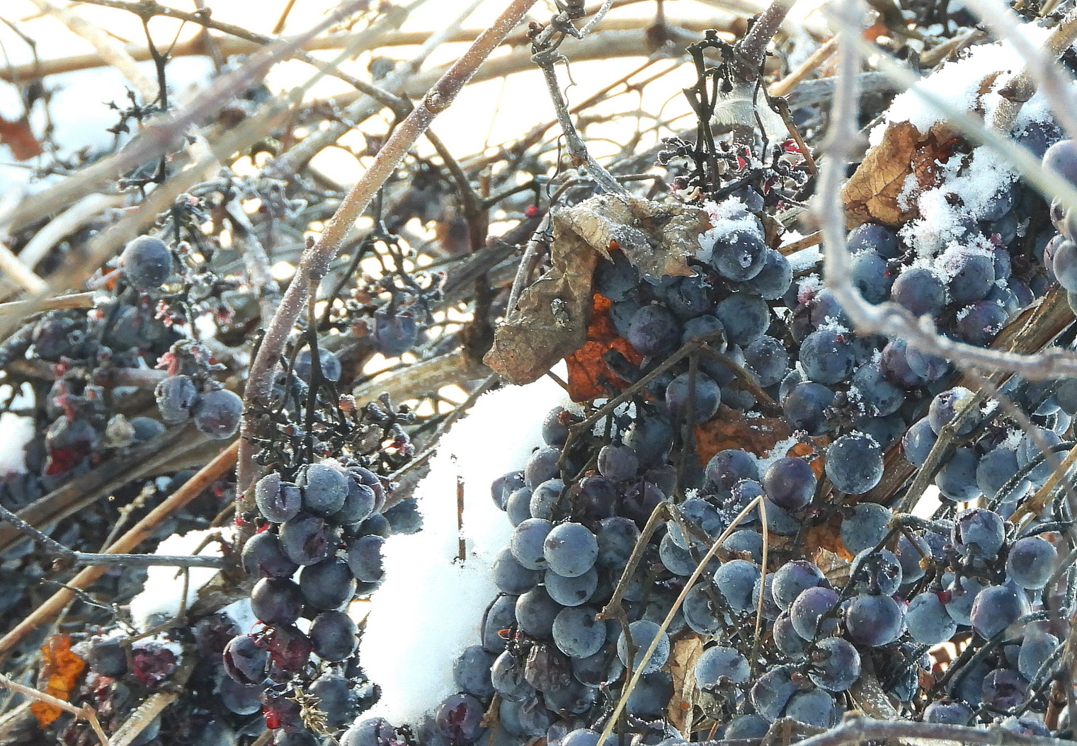 Некаторыя не спраўляліся з гэтым на месцы і ляцелі далей, на тую яблыню, дзе спрабавалі яе літаральна прапіхнуць у сябе раз за разам. А некаторыя не хацелі гэтак мучацца і дзяўблі тыя вінаградзіны як іншыя амялушкі яблыкі на яблыні. Тым не менш, даволі хутка налёты на вінаграднік прыпыніліся - напэўна птушкі набілі ягадамі страўнік і цяпер мусілі змяніць іх тэмпературу з -20 да +400С, бо інакш не змаглі б той вінаград ператравіць. А гэта лепш за ўсё рабіць у спакоі, чым яны і 'заняліся' на яблыні.