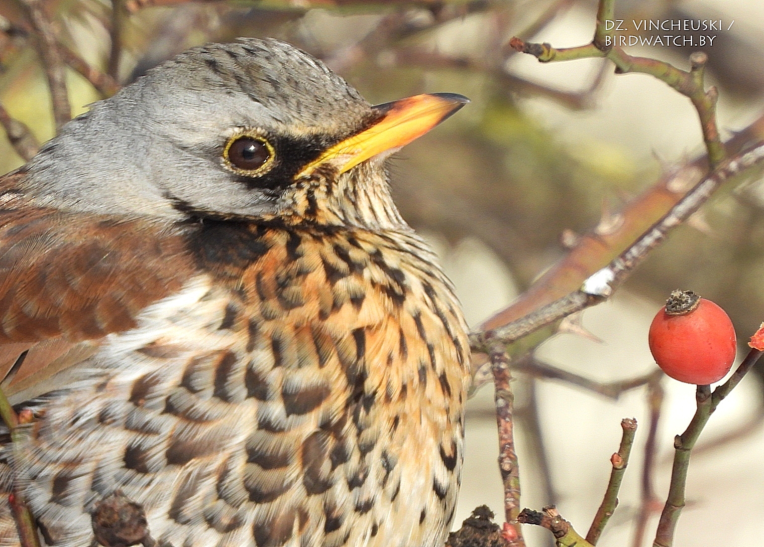 Хутчэй за ўсё праблема была ў тым, што днём тут пастаянна прызжалі, выходзілі ў Энерганагляд, вярталіся ў свае аўто і ад'язжалі тлумы людзей. А ўвечары, калі каля куста праходзілі толькі нешматлікія мясцовыя жыхары, было ўжо зацёмна каб нешта на кусце есці. Так і прастаяў бы гэты куст "нез'едзеным" да вясны, каб адзін з драздоў-піскуноў (Turdus pilaris) усё ж не адважыўся паспрабаваць сталавацца на гэтай шыпшыне ў белы дзень.