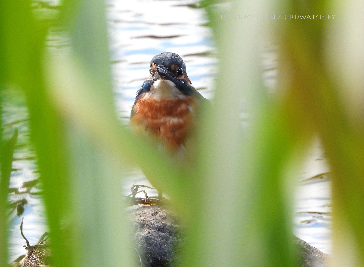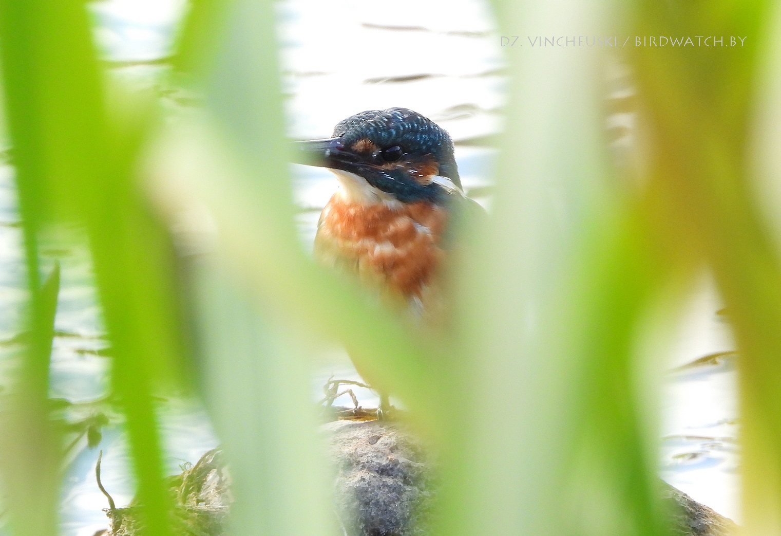 Прайшла можа хвіліна ці дзве і адбылося яшчэ больш нечаканае - зімародак пераляцеў і сеў на іншы валун, метрах у 5 ад мяне. Цяпер нас аддзяляла ад сябе толькі гэтая невялікая адлегласць і купіна зялёнай расліннасці. Хутчэй за ўсё калі б я трошкі пасунуўся ўбок і ўбачыў птушку адкрытай, яна б спалохалася б і адляцела. Але я знайшоў невялікі прасвет паміж вертыкальным лісцем і пачаў здымаць яго такім чынам.