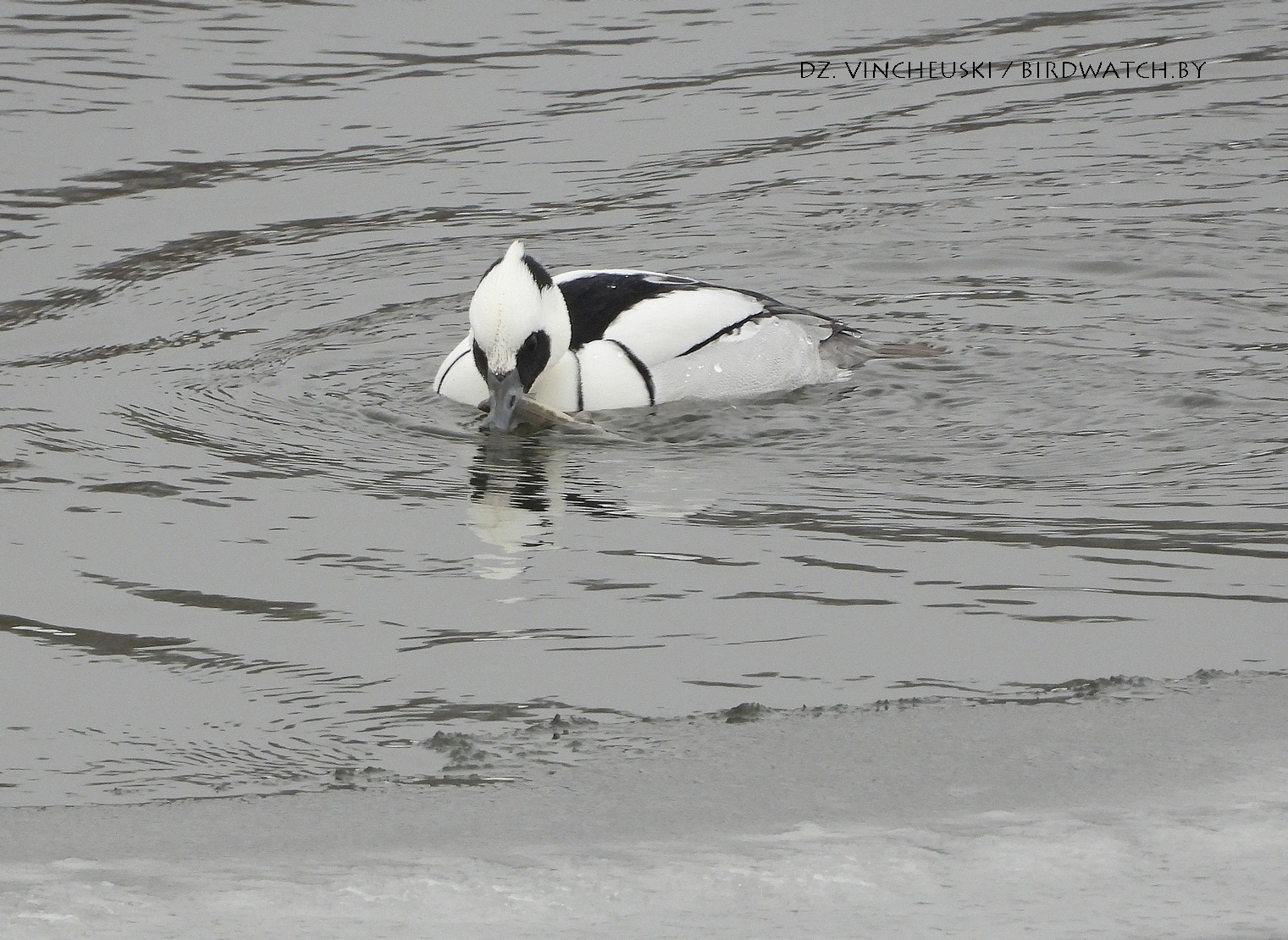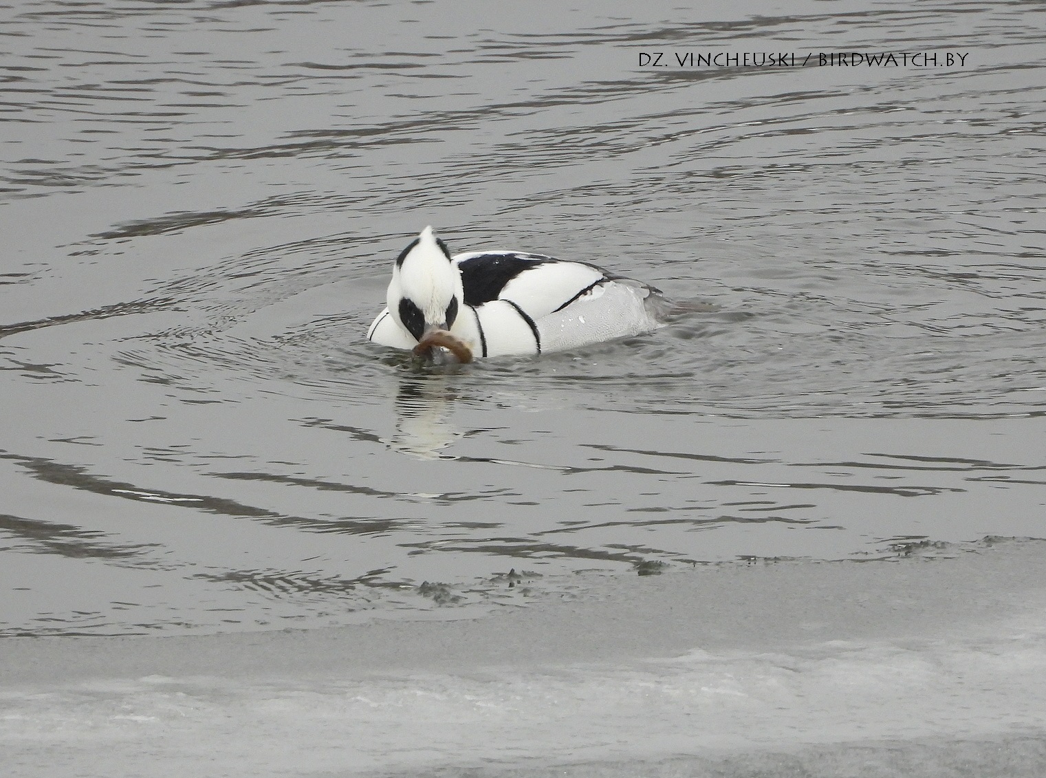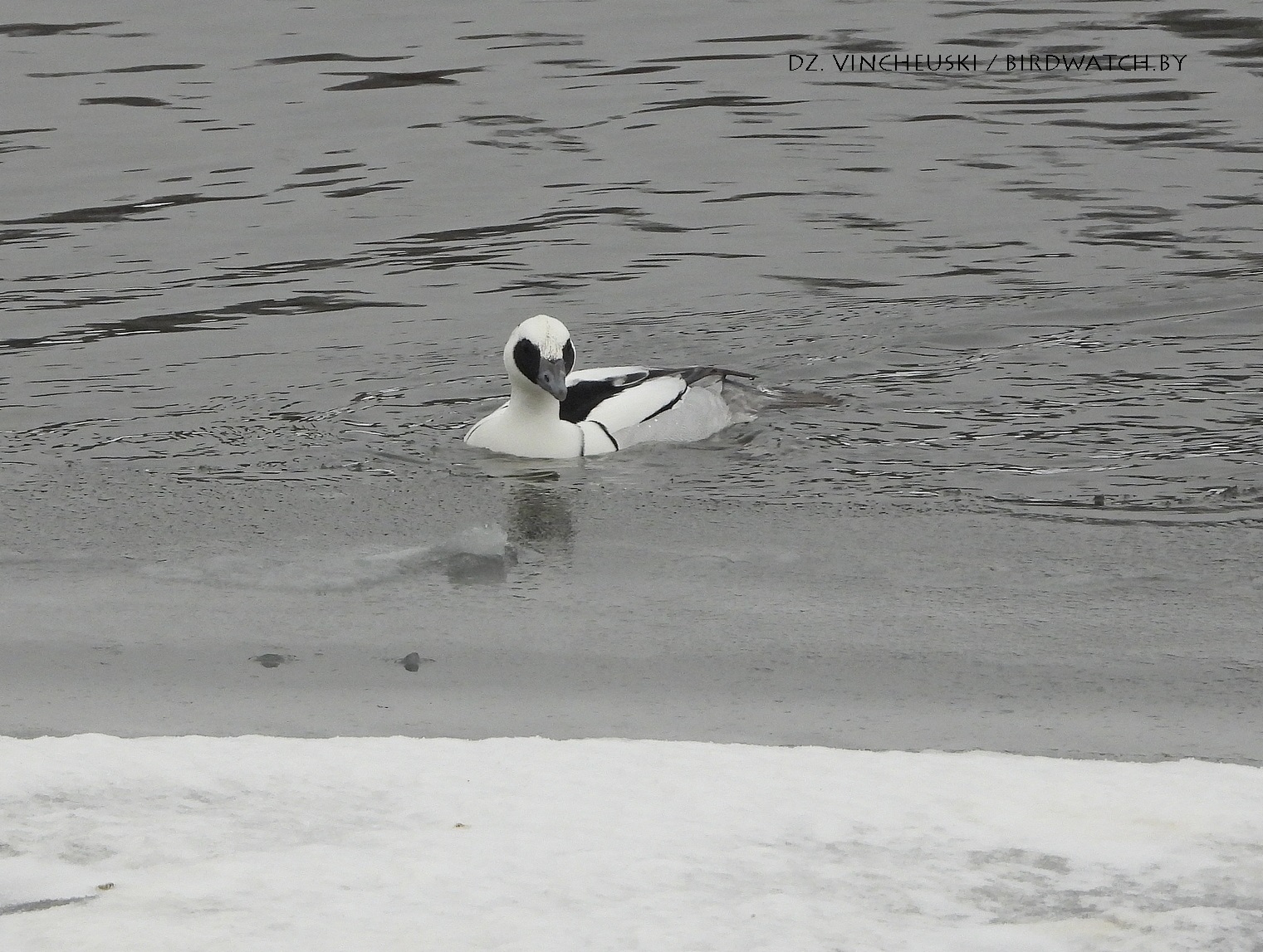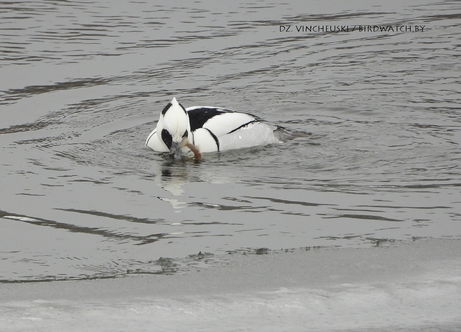 Трымаўся ён асобна ад іншых качак і яго выразная белізна нават у параўнанні з дзесяткамі самцоў гагалей прыцягнула маю ўвагу. Я пачаў здымаць яго здалёк, але даволі хутка ён падплыў да нашага берагу і амаль у самага края шырокай паласы льда пачаў ныраць-рыбачыць.