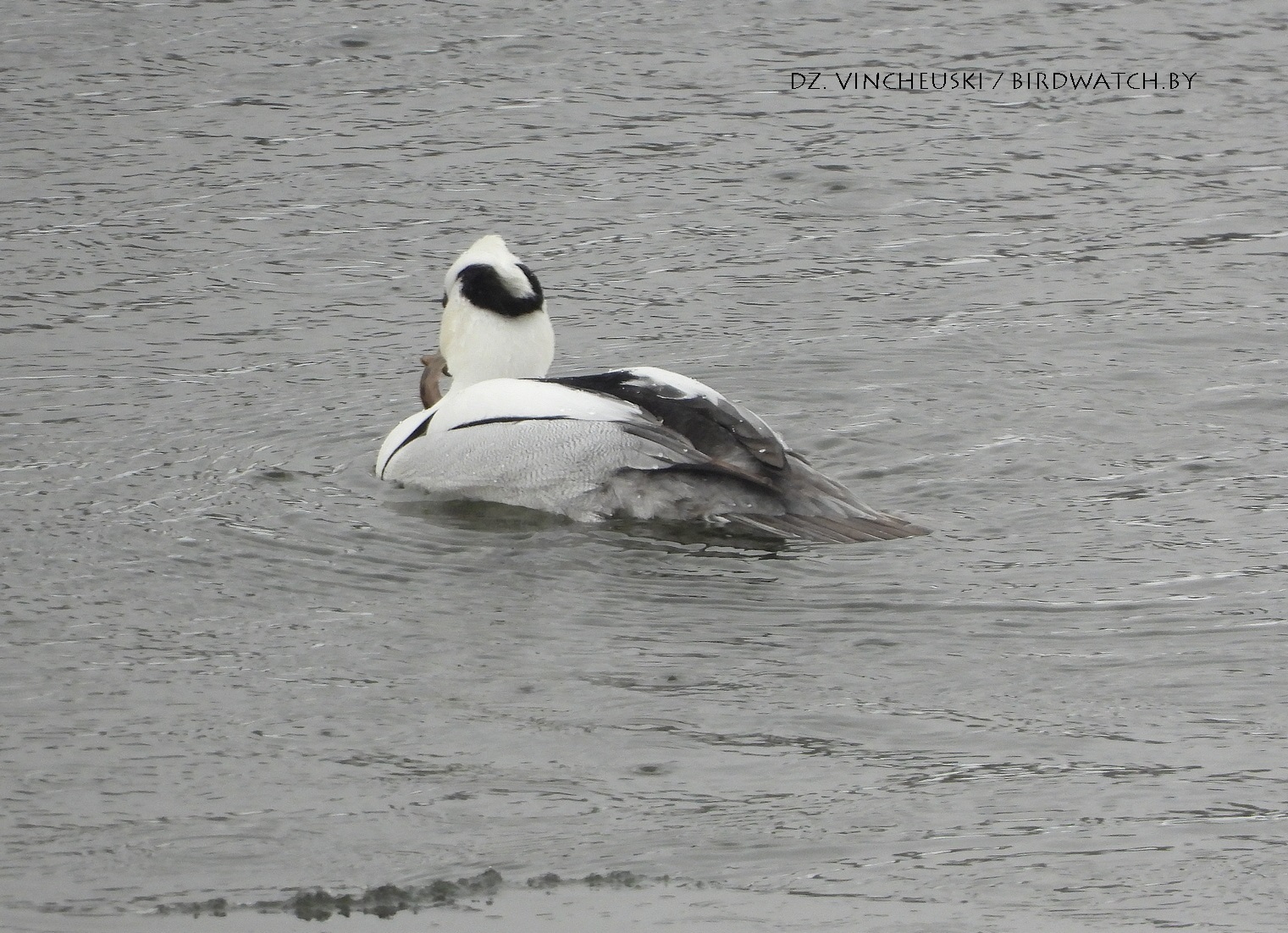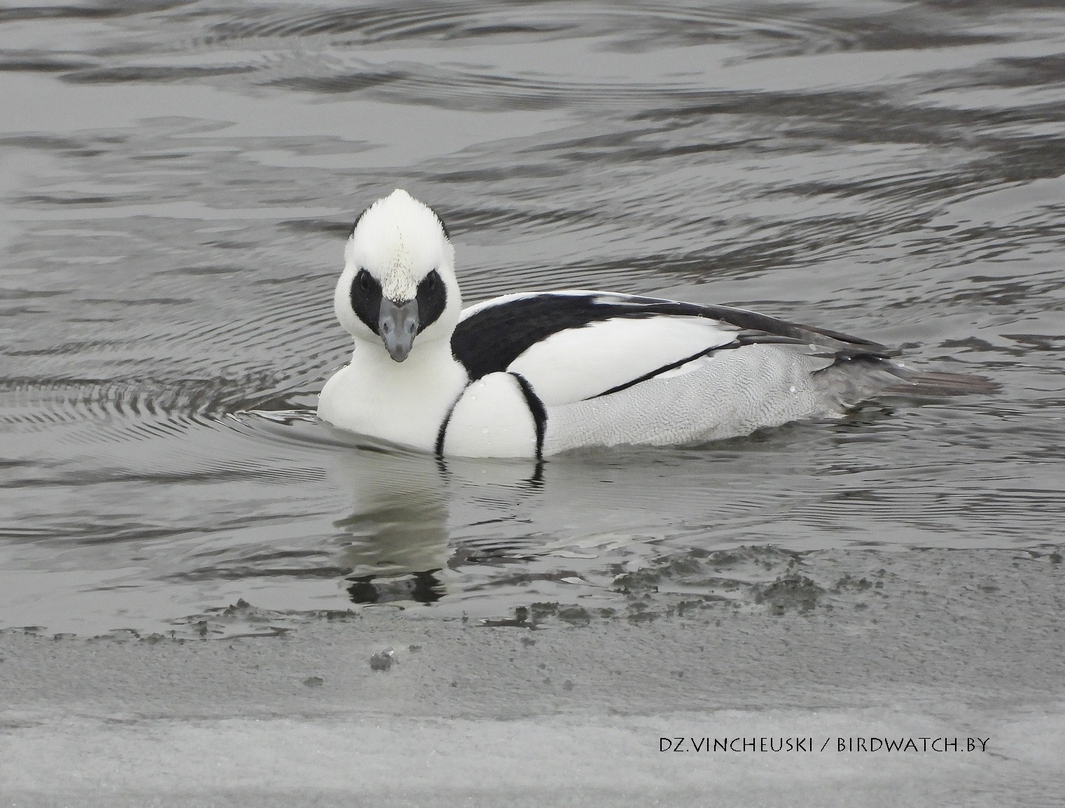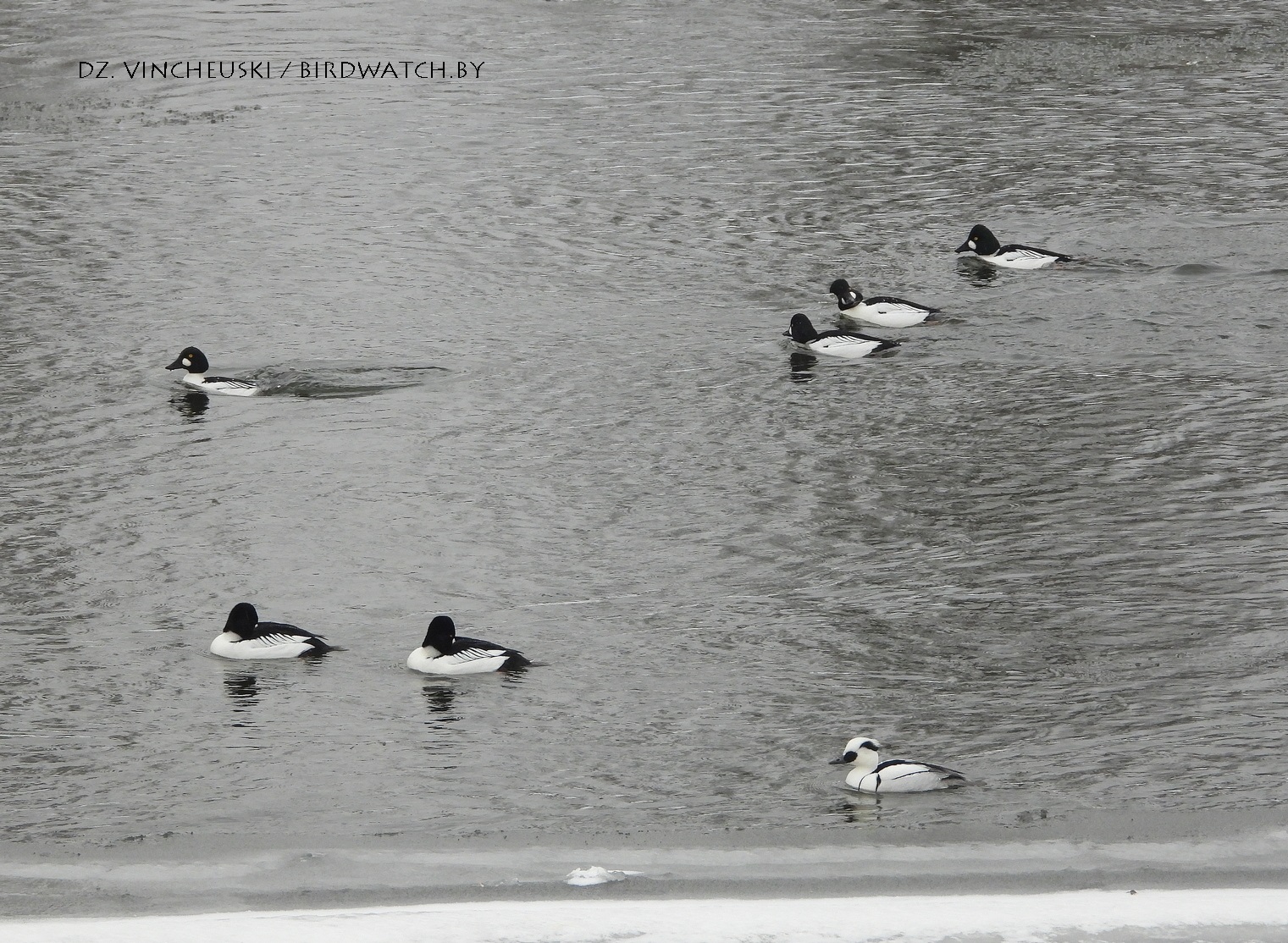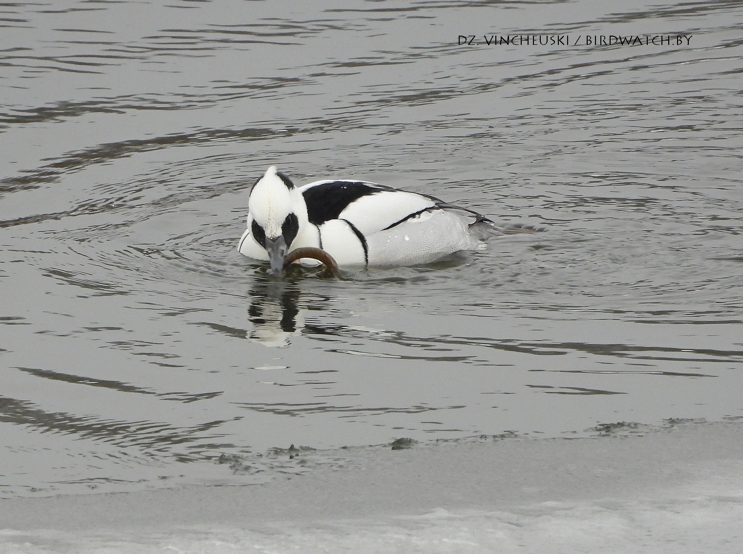 Трымаўся ён асобна ад іншых качак і яго выразная белізна нават у параўнанні з дзесяткамі самцоў гагалей прыцягнула маю ўвагу. Я пачаў здымаць яго здалёк, але даволі хутка ён падплыў да нашага берагу і амаль у самага края шырокай паласы льда пачаў ныраць-рыбачыць.
