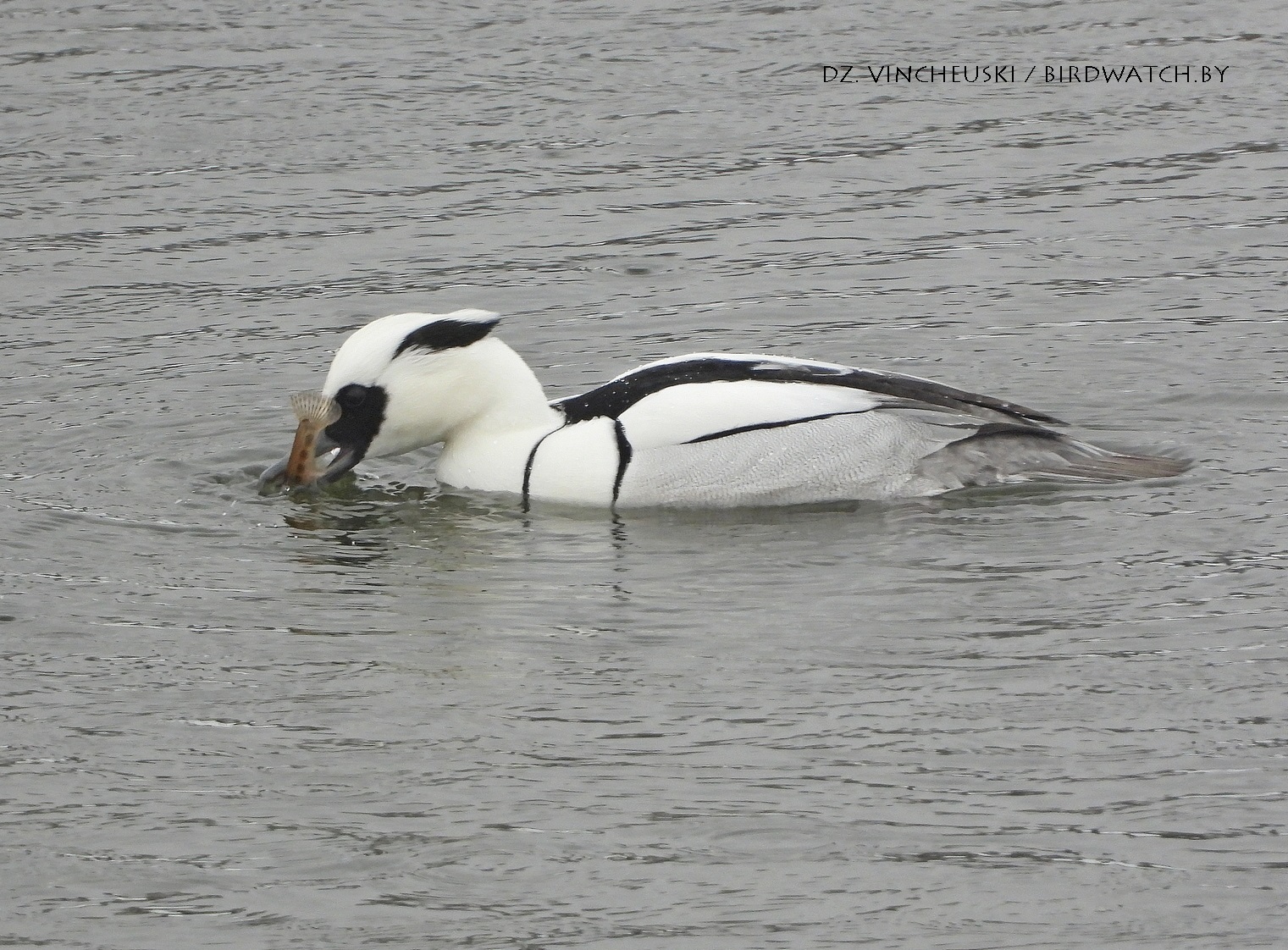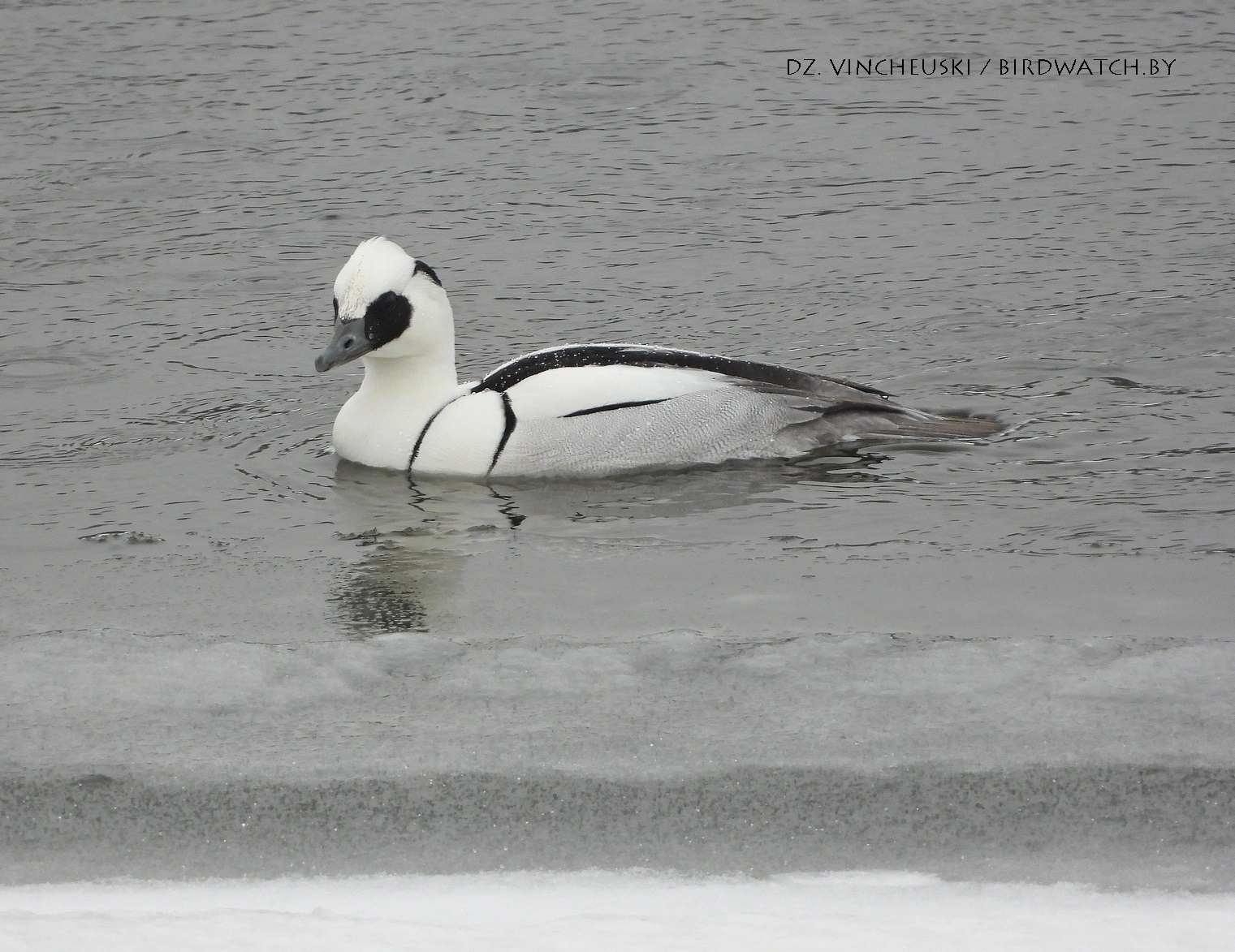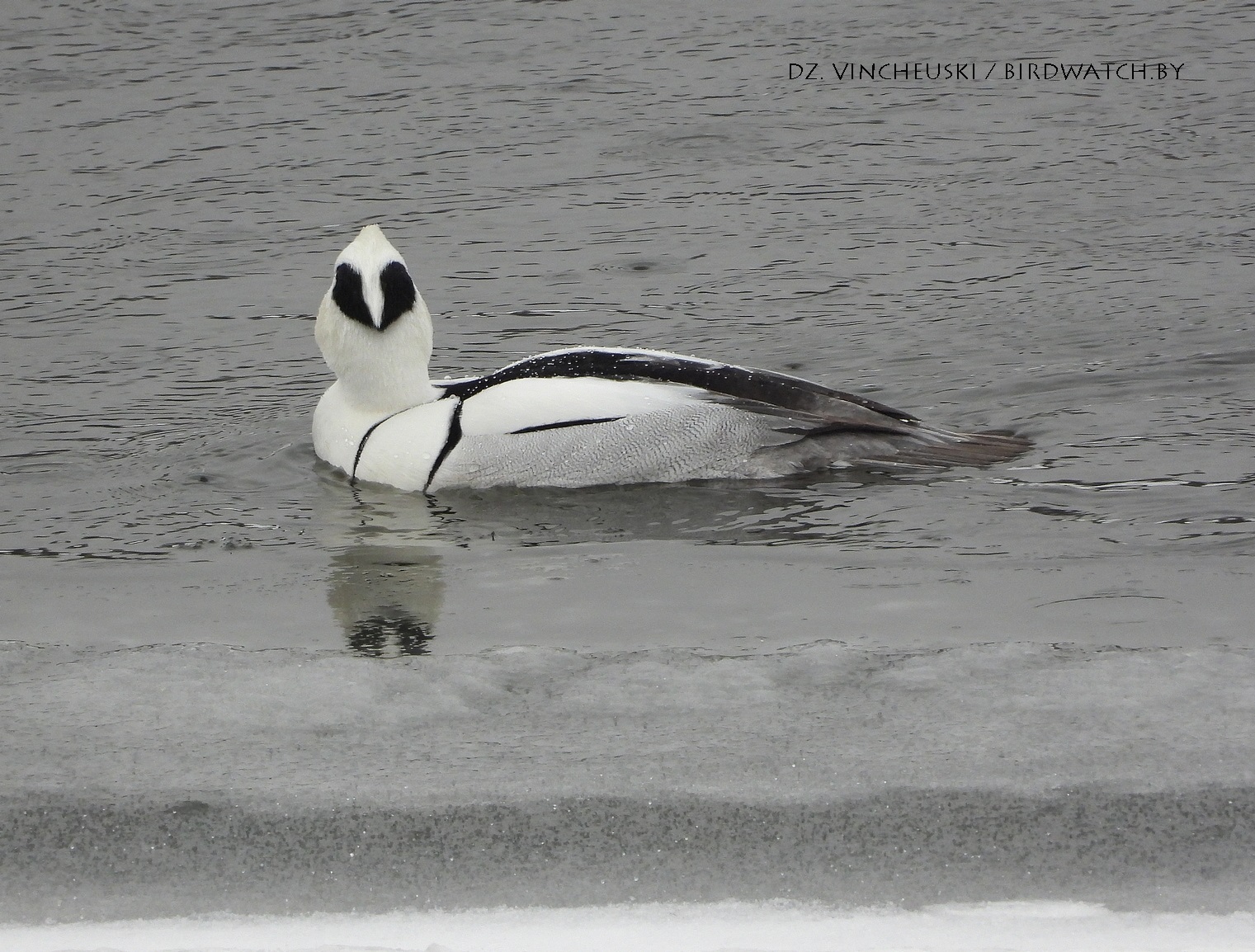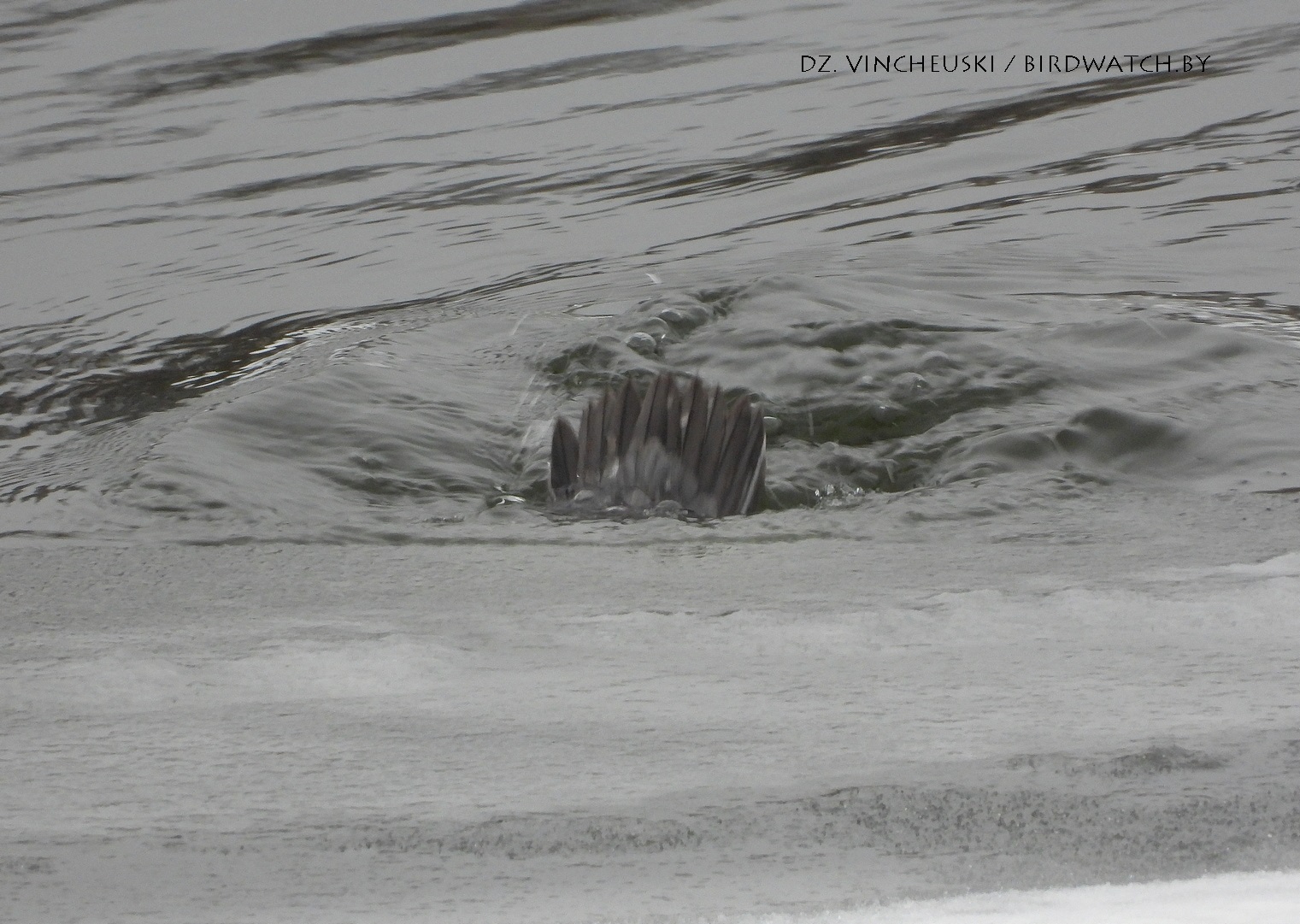 Трымаўся ён асобна ад іншых качак і яго выразная белізна нават у параўнанні з дзесяткамі самцоў гагалей прыцягнула маю ўвагу. Я пачаў здымаць яго здалёк, але даволі хутка ён падплыў да нашага берагу і амаль у самага края шырокай паласы льда пачаў ныраць-рыбачыць.
