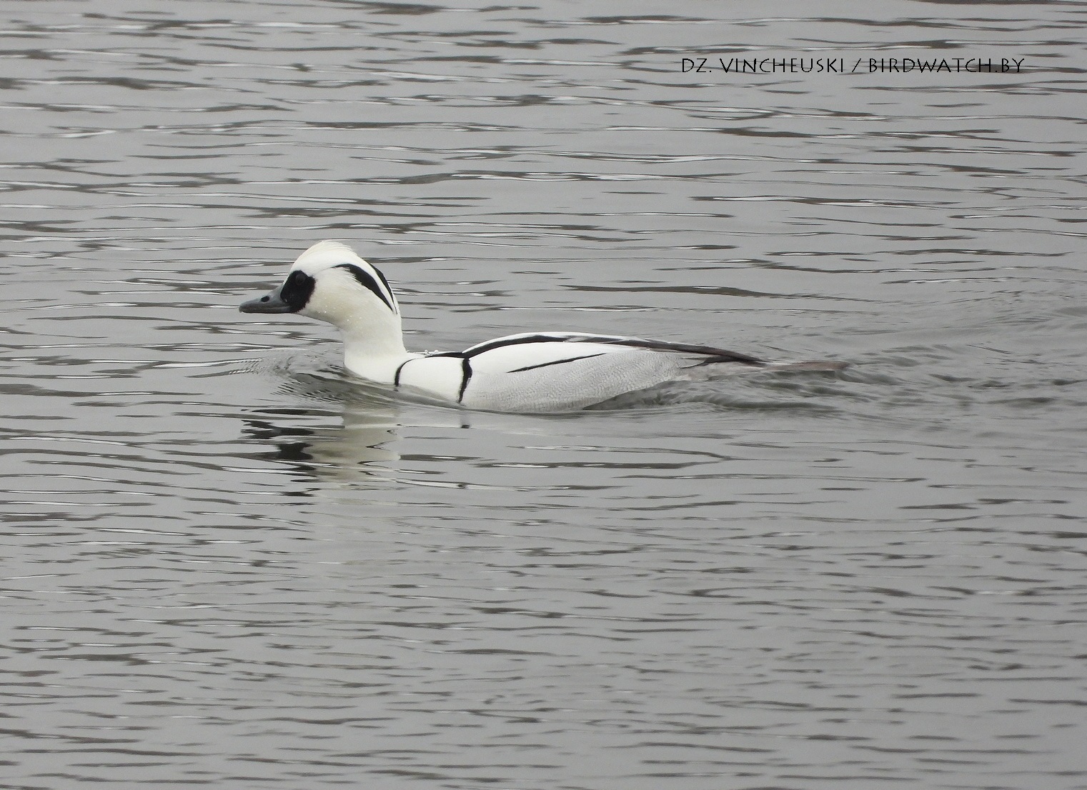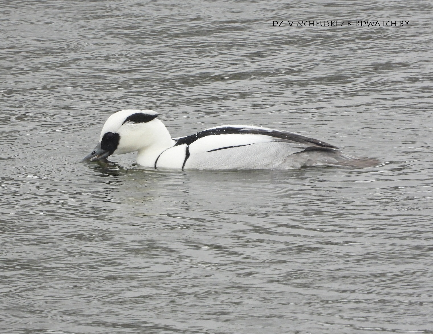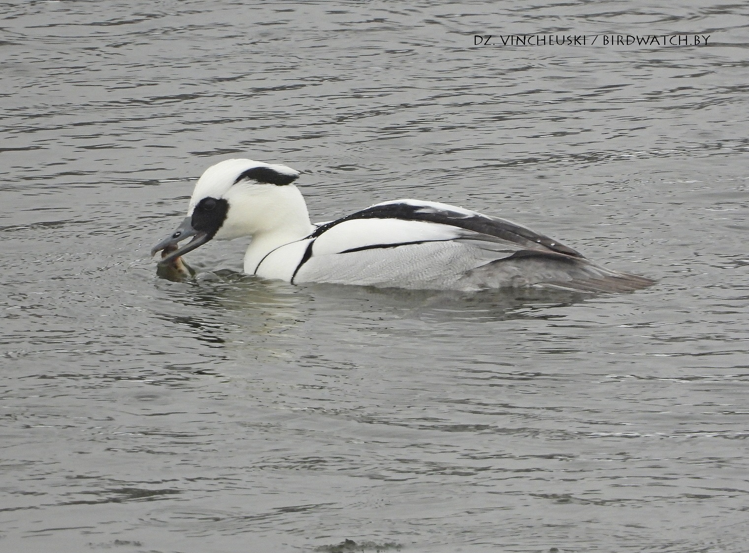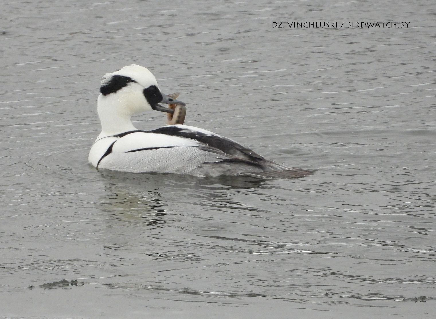 Трымаўся ён асобна ад іншых качак і яго выразная белізна нават у параўнанні з дзесяткамі самцоў гагалей прыцягнула маю ўвагу. Я пачаў здымаць яго здалёк, але даволі хутка ён падплыў да нашага берагу і амаль у самага края шырокай паласы льда пачаў ныраць-рыбачыць.