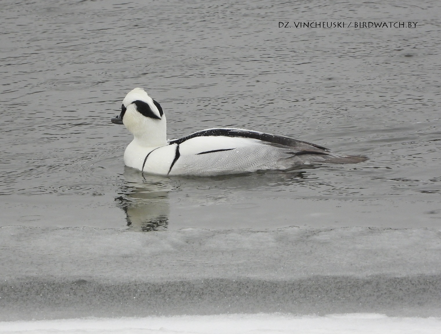 У першы дзень адлігі, калі час ад часу падаў дробны дожджык, на Нёмане ў цэнтры гораду з'явіўся самец савука-лутка (Mergellus albellus). Самак гэтага віду я бачыў тут і ў мінулыя зімы (хаця і не штогод), таксама гэтай зімой, а вось самца ў межах гораду ўбачыў упершыню.