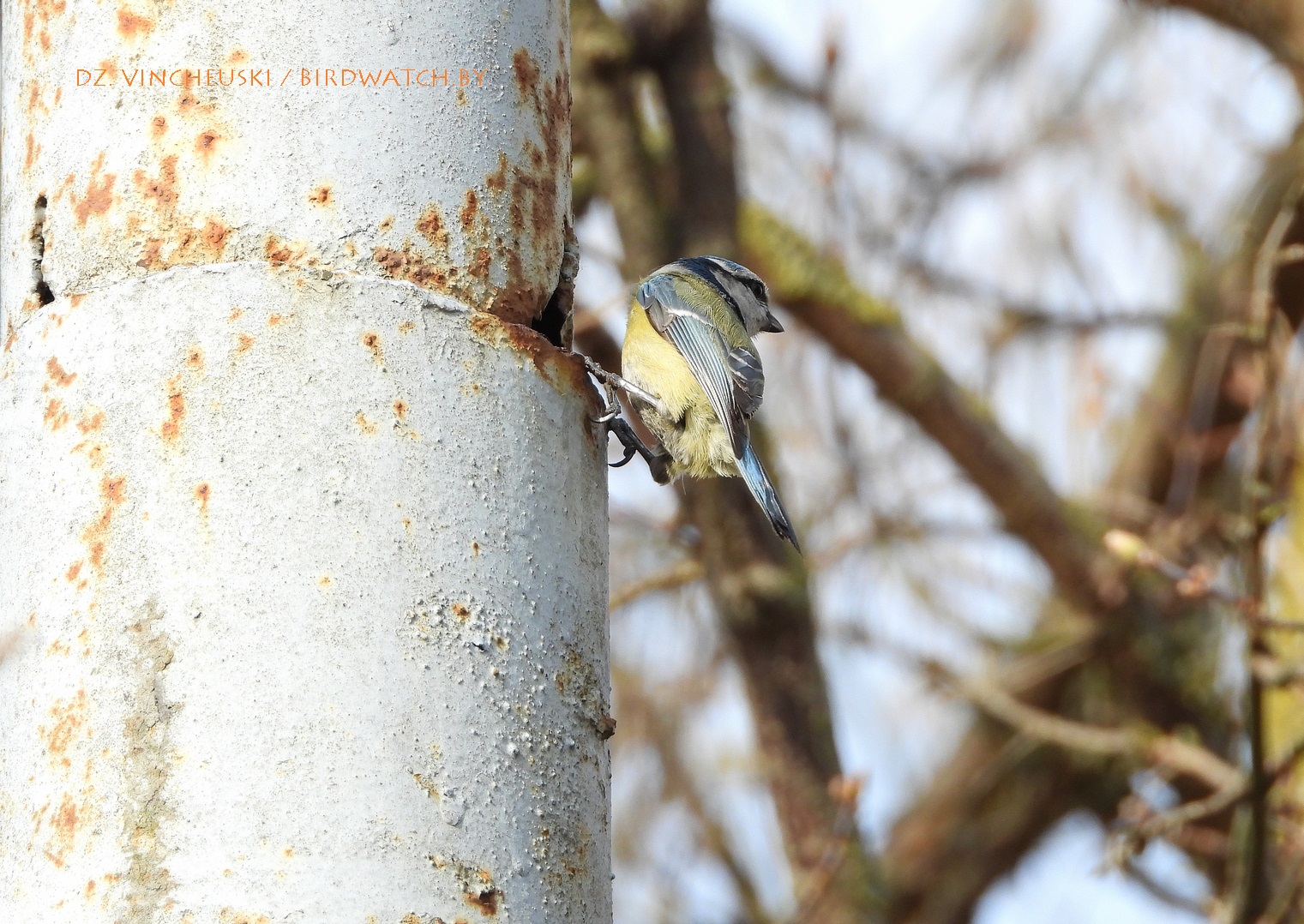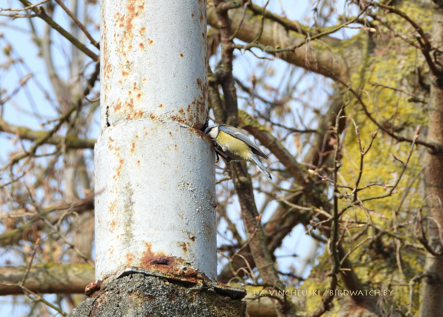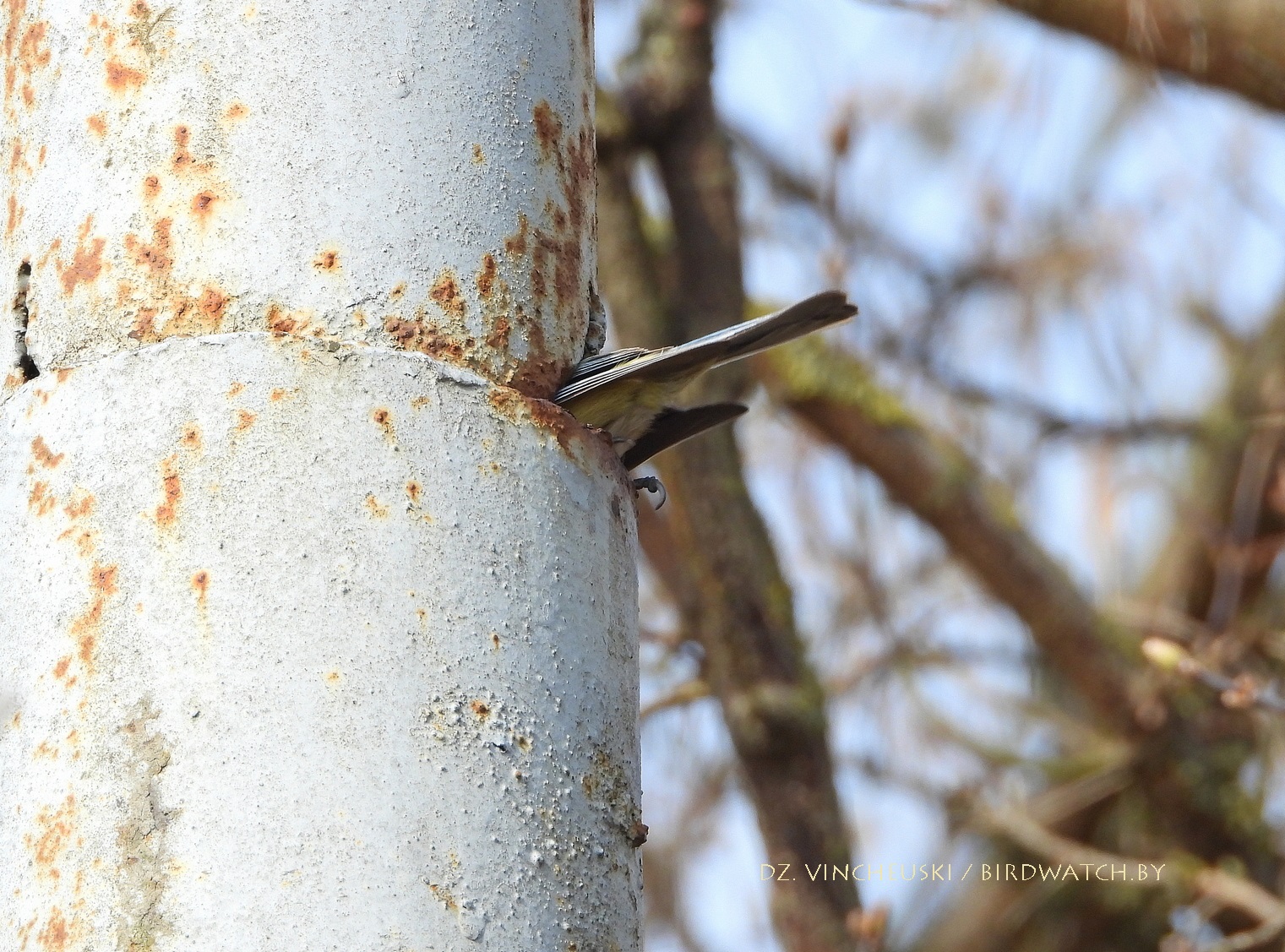 Другі тып магчымай трагедыі даволі падобны на першы, толькі што дапамагчы ў ім птушкам маларэальна. Гэтая пара сінічак (на здымках ніжэй трэцяга ці другога пасля тэксту) зусім нечакана для мяне пасля таго, як некалькі хвілін старанна харчавалася на коціках даволі высокай вярбы, потым паказала і выбранае месца для гнездавання - нішу ў металічнай частцы слупа, у якую яны забіраліся праз праржавелую дзірку. Нечым закрыць ці заткнуць яе на такой вышыні нерэальна, але можа птушаняты змогуць выбрацца праз яе і выляцець.