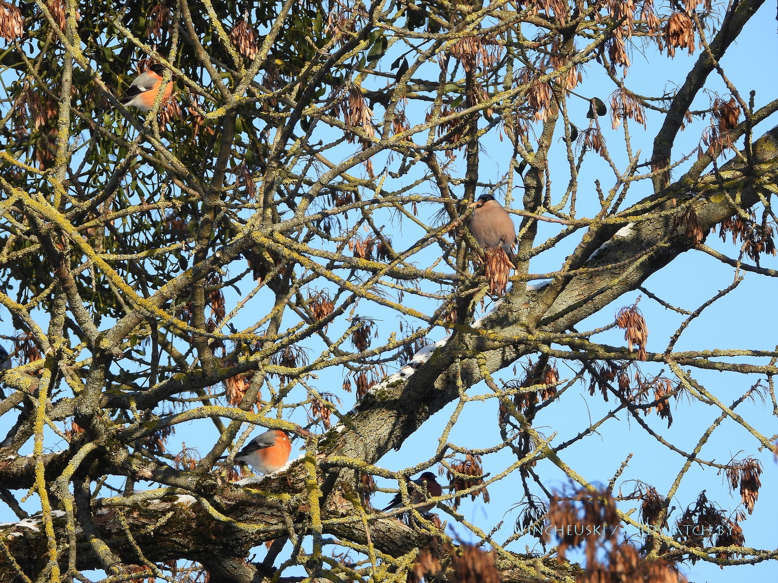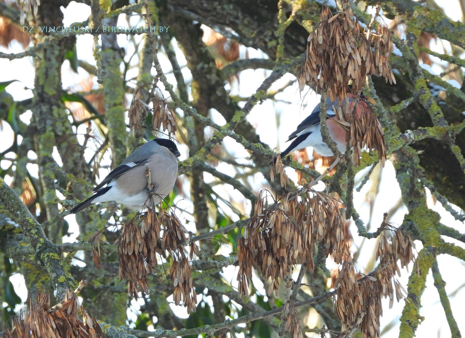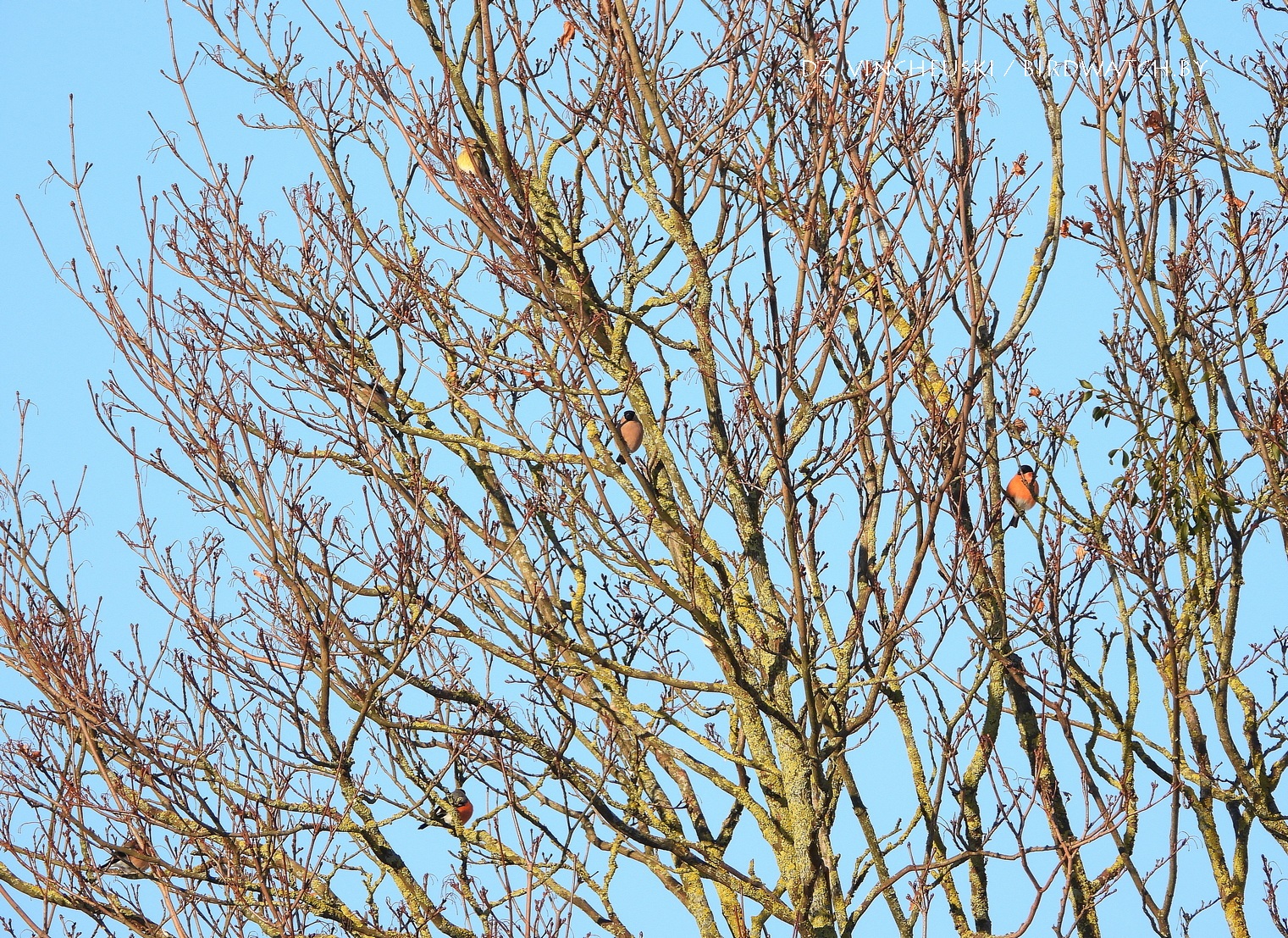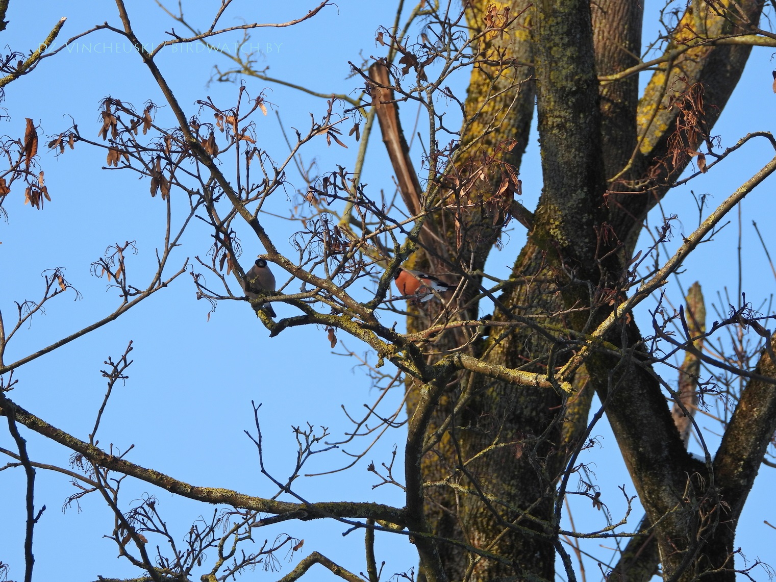 Я вяртаўся дадому праз стары мікрараён і калі праходзіў недалёка ад агароджы дзіцячага садку, па абодва бакі якой засталіся рэшткі старага саду, пачуў не вельмі выразнае "...гіль... гіль..". Гэта яўна быў гіль (P. pyrrhula) я і ўжо ведаў каго мне трэба шукаць на дрэвах навокал. Я вярнуўся на некалькі метраў назад па сцежцы ў снезе, прайшоў наперад, але як ні ўглядаўся ў невысокія дрэвы, нікога не ўбачыў. "Можа прычудзілася" - падумаў і пайшоў далей. Але тут зноў пачуў знаёёмую пазыўку і зноў пачаў азірацца і гэтаксама безвынікова.  Павярнуў да наднёманскай тэрасы паміж крайнім радам дамоў і тут наперадзе ўбачыў гілёў! Яны сядзелі даволі высока на старых клёнах, але мала хто з іх еў кляновыя крылаткі - большасць проста адпачывала.