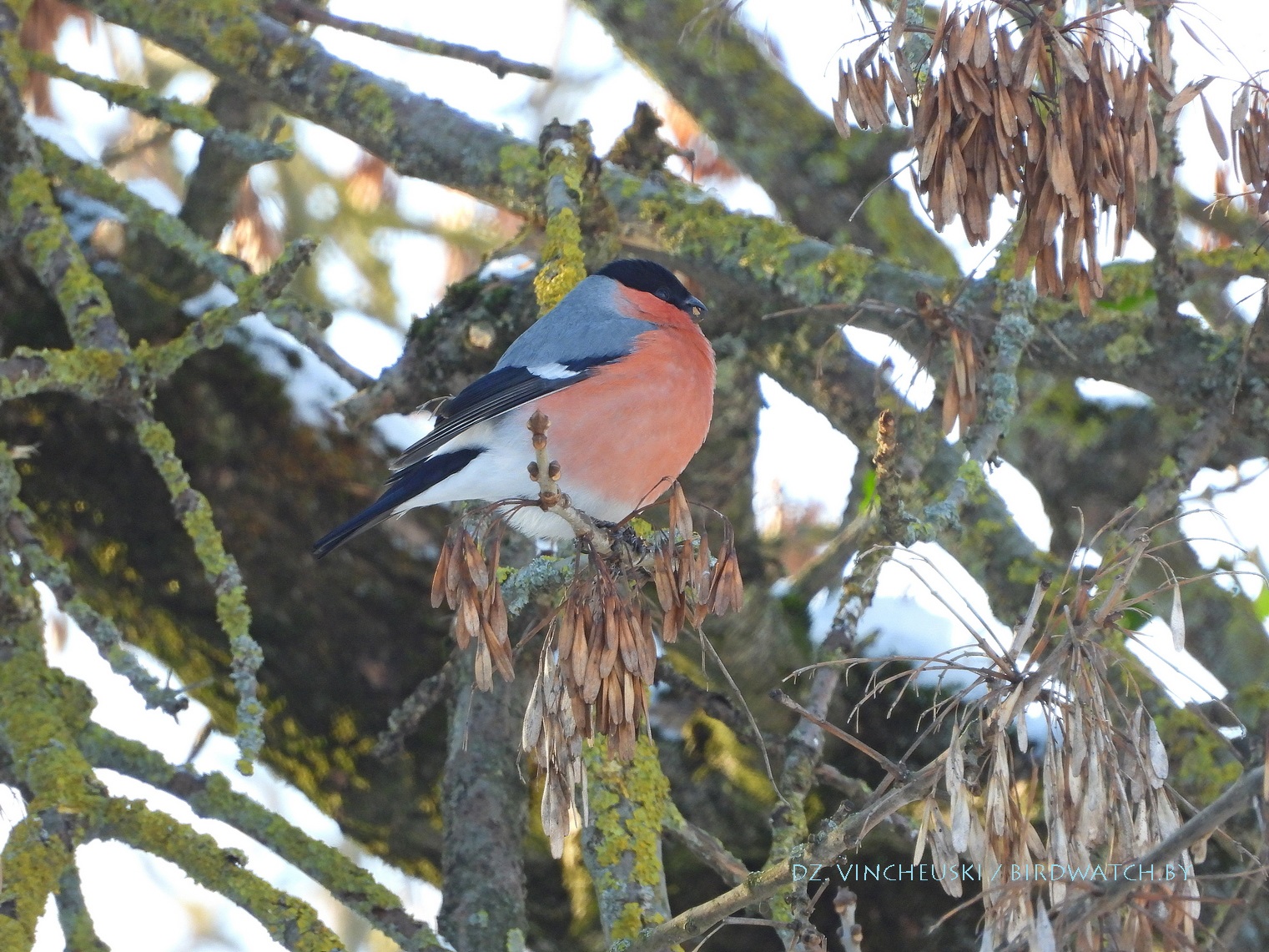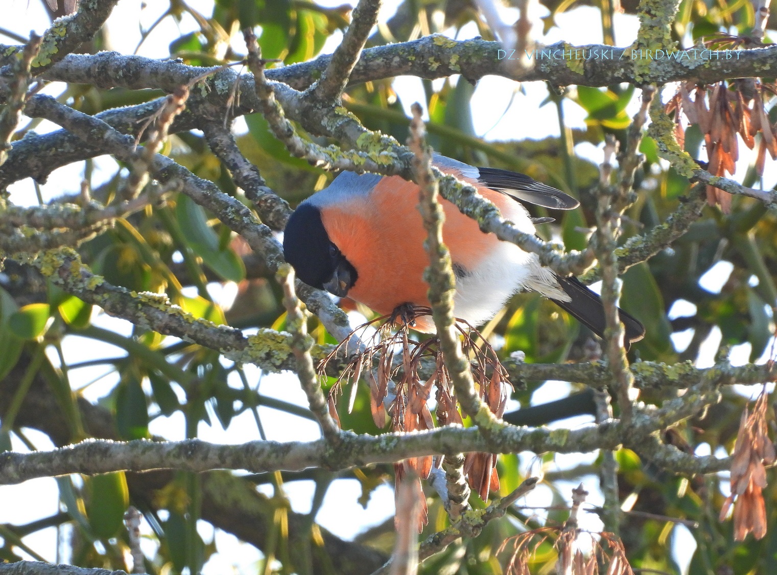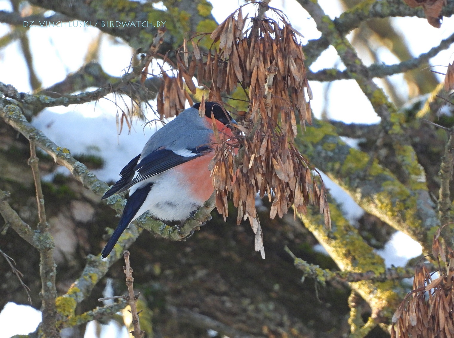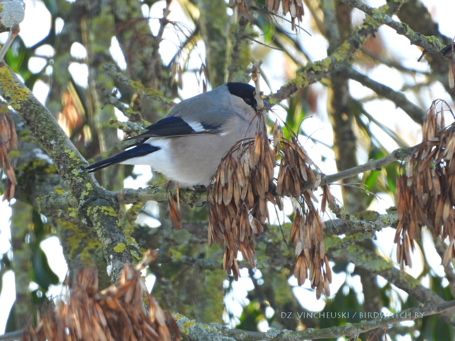 Я вяртаўся дадому праз стары мікрараён і калі праходзіў недалёка ад агароджы дзіцячага садку, па абодва бакі якой засталіся рэшткі старага саду, пачуў не вельмі выразнае "...гіль... гіль..". Гэта яўна быў гіль (P. pyrrhula) я і ўжо ведаў каго мне трэба шукаць на дрэвах навокал. Я вярнуўся на некалькі метраў назад па сцежцы ў снезе, прайшоў наперад, але як ні ўглядаўся ў невысокія дрэвы, нікога не ўбачыў. "Можа прычудзілася" - падумаў і пайшоў далей. Але тут зноў пачуў знаёёмую пазыўку і зноў пачаў азірацца і гэтаксама безвынікова.  Павярнуў да наднёманскай тэрасы паміж крайнім радам дамоў і тут наперадзе ўбачыў гілёў! Яны сядзелі даволі высока на старых клёнах, але мала хто з іх еў кляновыя крылаткі - большасць проста адпачывала.