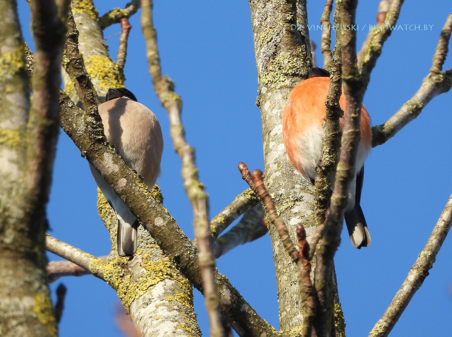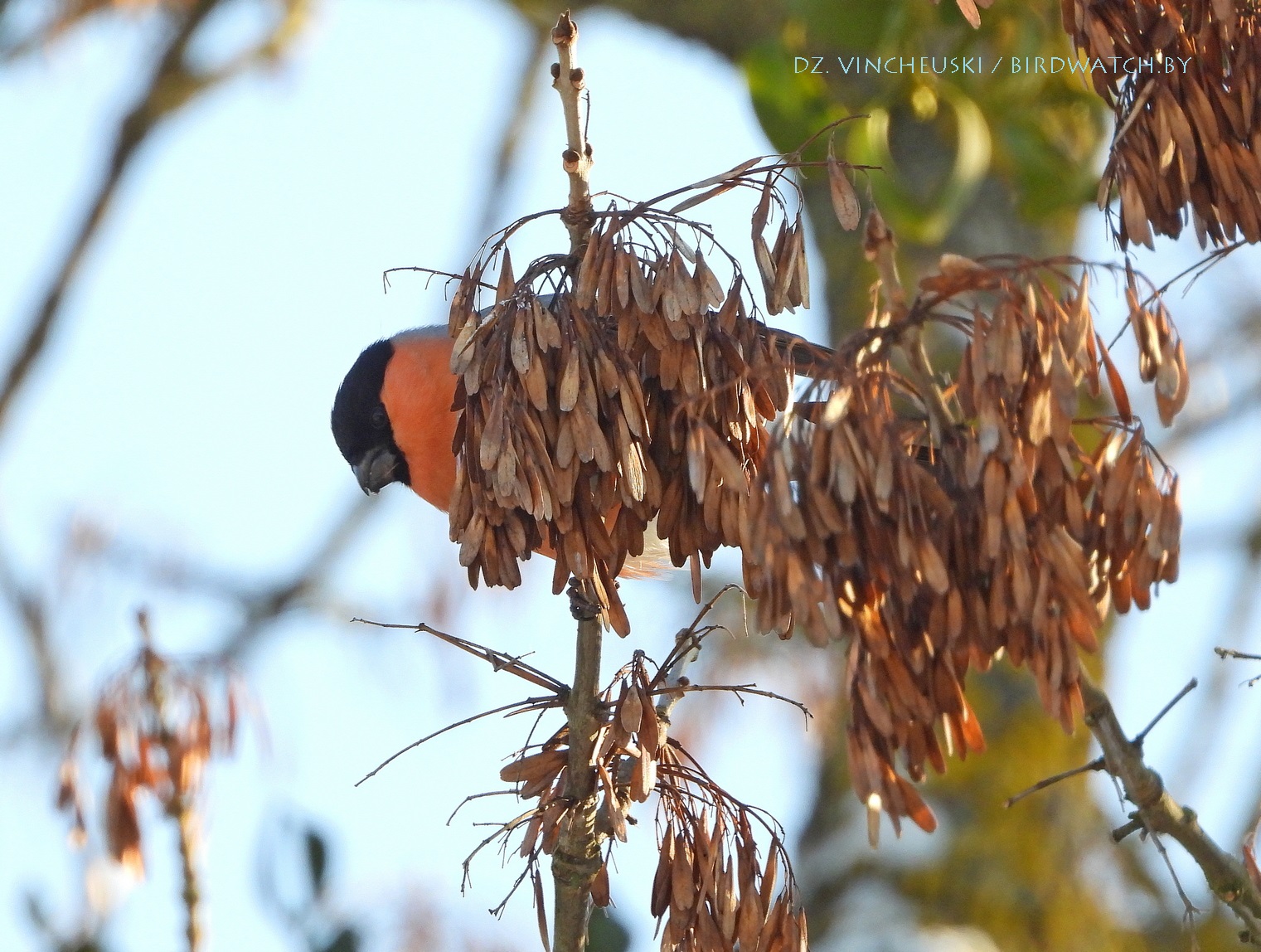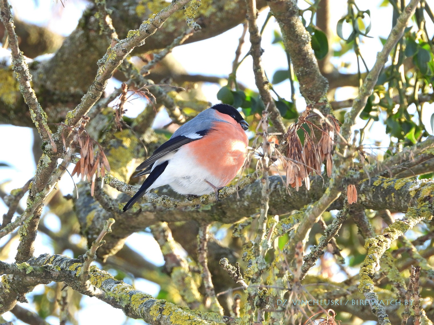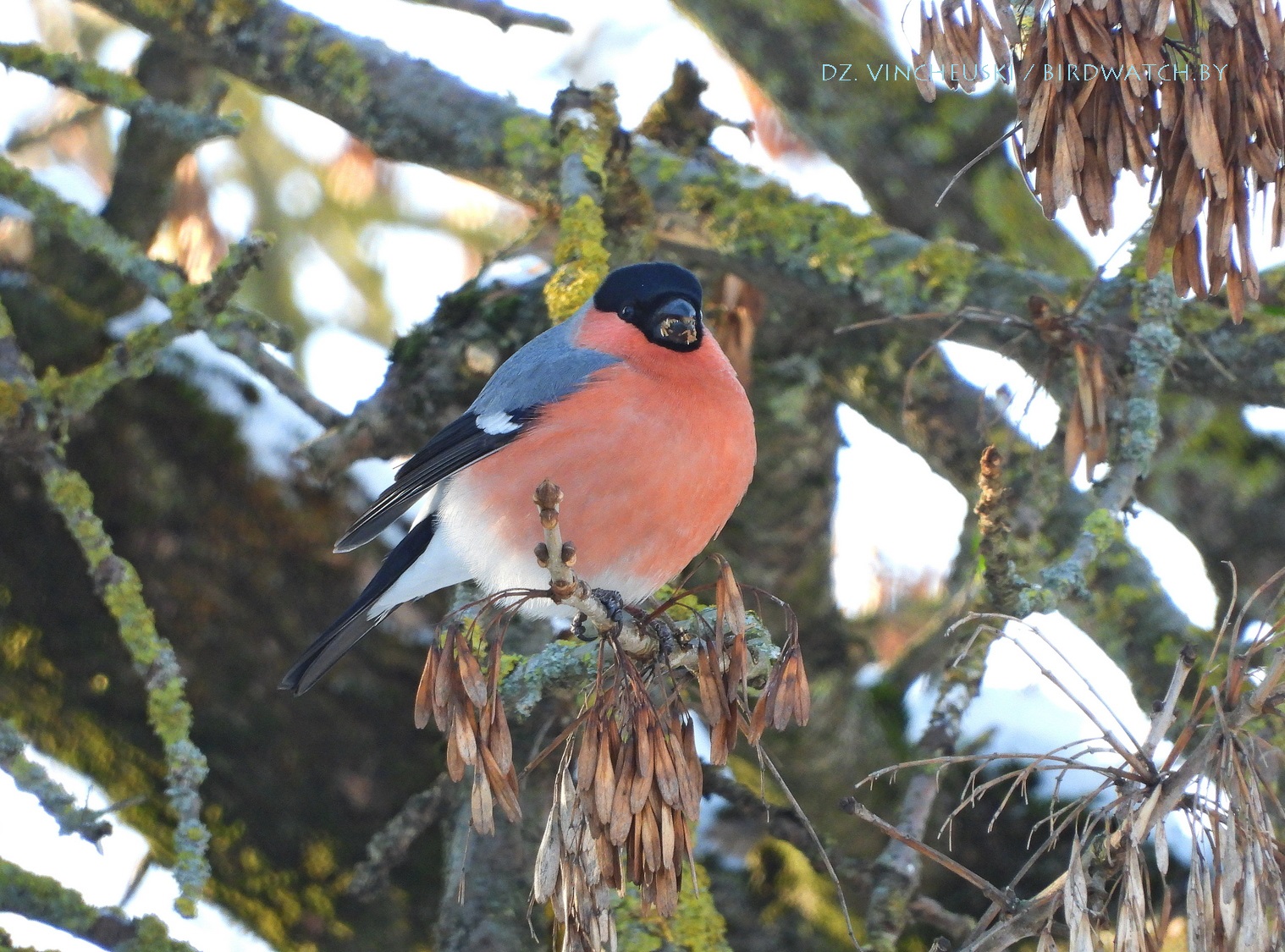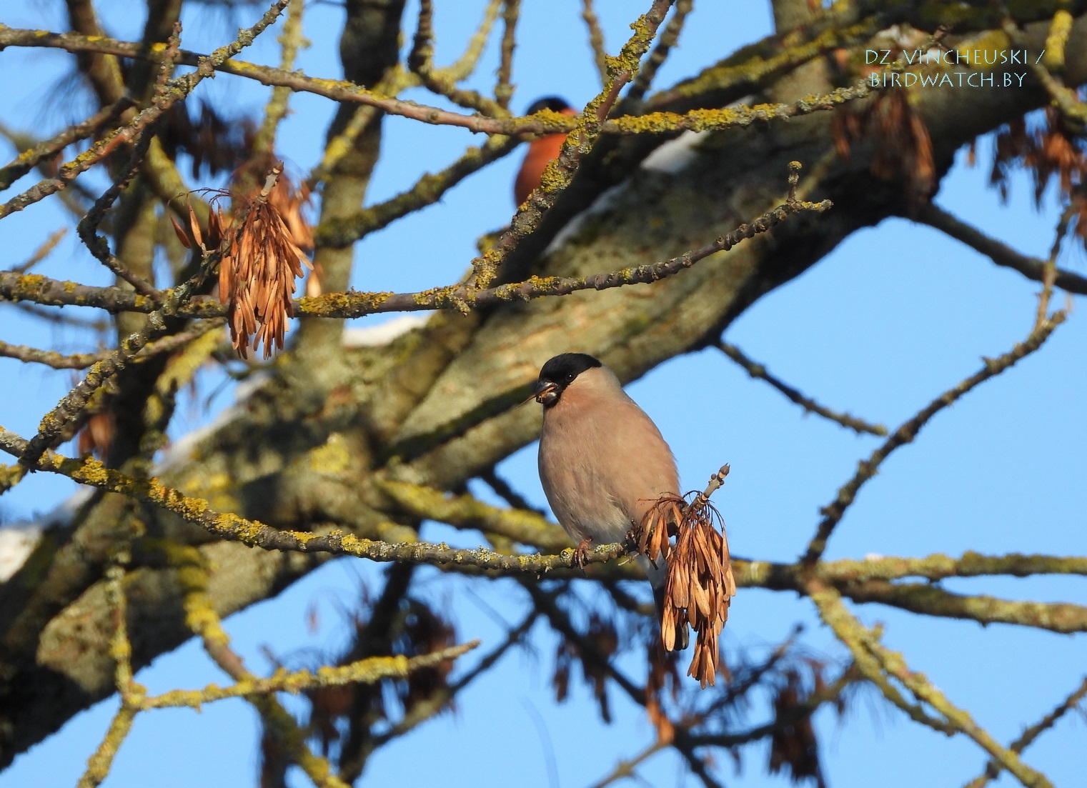 Я вяртаўся дадому праз стары мікрараён і калі праходзіў недалёка ад агароджы дзіцячага садку, па абодва бакі якой засталіся рэшткі старага саду, пачуў не вельмі выразнае "...гіль... гіль..". Гэта яўна быў гіль (P. pyrrhula) я і ўжо ведаў каго мне трэба шукаць на дрэвах навокал. Я вярнуўся на некалькі метраў назад па сцежцы ў снезе, прайшоў наперад, але як ні ўглядаўся ў невысокія дрэвы, нікога не ўбачыў. "Можа прычудзілася" - падумаў і пайшоў далей. Але тут зноў пачуў знаёёмую пазыўку і зноў пачаў азірацца і гэтаксама безвынікова.  Павярнуў да наднёманскай тэрасы паміж крайнім радам дамоў і тут наперадзе ўбачыў гілёў! Яны сядзелі даволі высока на старых клёнах, але мала хто з іх еў кляновыя крылаткі - большасць проста адпачывала.
