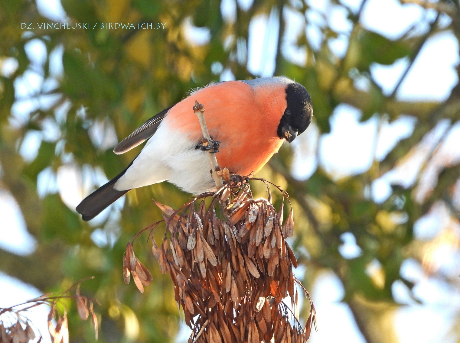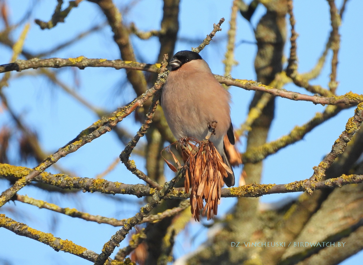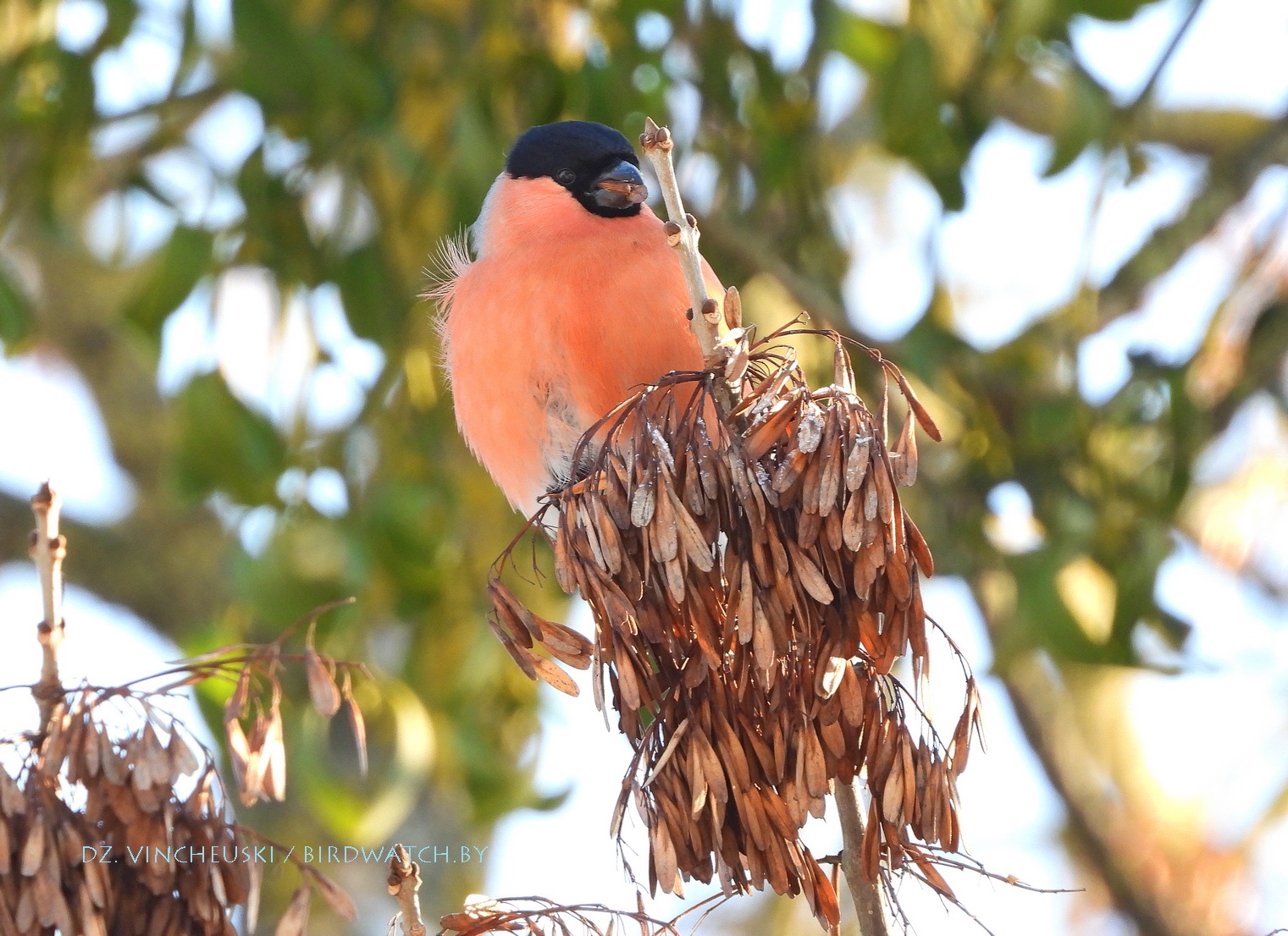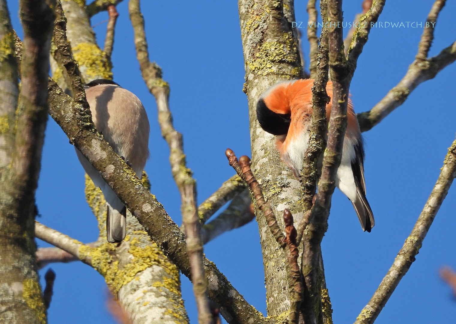 Я вяртаўся дадому праз стары мікрараён і калі праходзіў недалёка ад агароджы дзіцячага садку, па абодва бакі якой засталіся рэшткі старага саду, пачуў не вельмі выразнае "...гіль... гіль..". Гэта яўна быў гіль (P. pyrrhula) я і ўжо ведаў каго мне трэба шукаць на дрэвах навокал. Я вярнуўся на некалькі метраў назад па сцежцы ў снезе, прайшоў наперад, але як ні ўглядаўся ў невысокія дрэвы, нікога не ўбачыў. "Можа прычудзілася" - падумаў і пайшоў далей. Але тут зноў пачуў знаёёмую пазыўку і зноў пачаў азірацца і гэтаксама безвынікова.  Павярнуў да наднёманскай тэрасы паміж крайнім радам дамоў і тут наперадзе ўбачыў гілёў! Яны сядзелі даволі высока на старых клёнах, але мала хто з іх еў кляновыя крылаткі - большасць проста адпачывала.