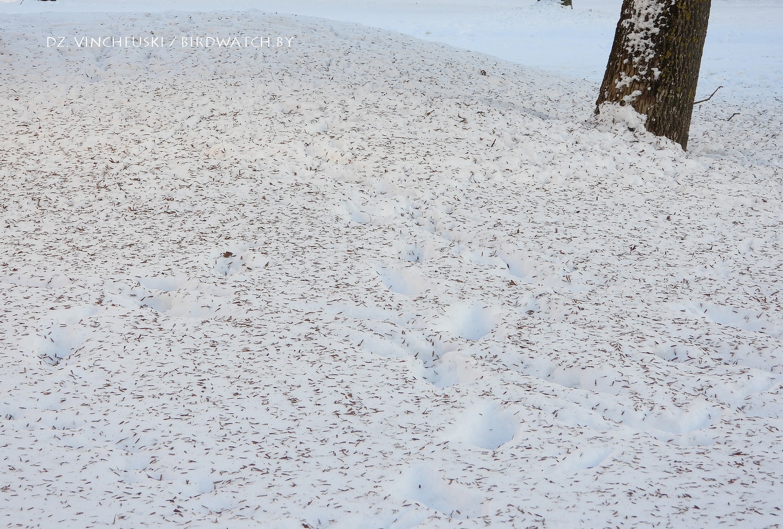 І тут мне пашанцавала - пасля нядоўгіх вандровак я насупраць сонца, якое ўжо сядала, заўважыў рух на цёмным фоне раскідзістага пенсільванскага ясеня і ўжо быў амаль упэўнены, што знайшоў гілёў! Так і ёсць - гэта яны. Стараюцца без перапынку вылушчваць насенне, якога вельмі багата на гэтым дрэве. А калі глянуў на снег пад ясенем, то ўбачыў, колькі гілі яго ўжо з'елі. Час ад часу птушкі пераляталі з галіны на галіну, але ўсё цішком, без кантактных гукаў - на іх няма часу з-за марозу, ды і рот жа заняты: