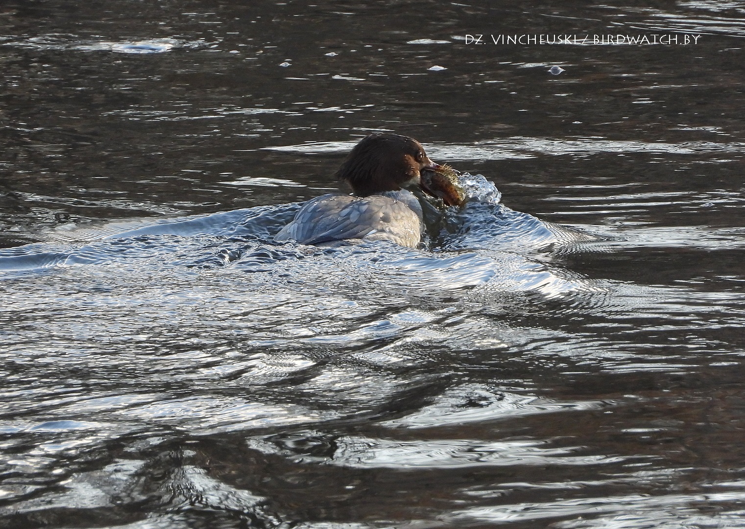 А вось іншая, метрах у 30 ніжэй па плыні Нёмана, вынырнула з рыбкай пабольш. І я першыя некалькі секунд не мог разглядзець хто гэта, бо птушка трымала яе амаль цалкам у вадзе. Аднак хутка аказалася, што гэта быў джгір, або ёрш (Gymnocephalus cernuus), які і не думаў здавацца. Ён падняў свой спінны плаўнік такім чынам, што калючкі не давалі самцы савука праглынуць яго. І колькі яна не папраўляла здабычу, лягчэй ёй не станавілася і прыкладна праз хвіліну ёрш быў выпушчаны назад у раку.