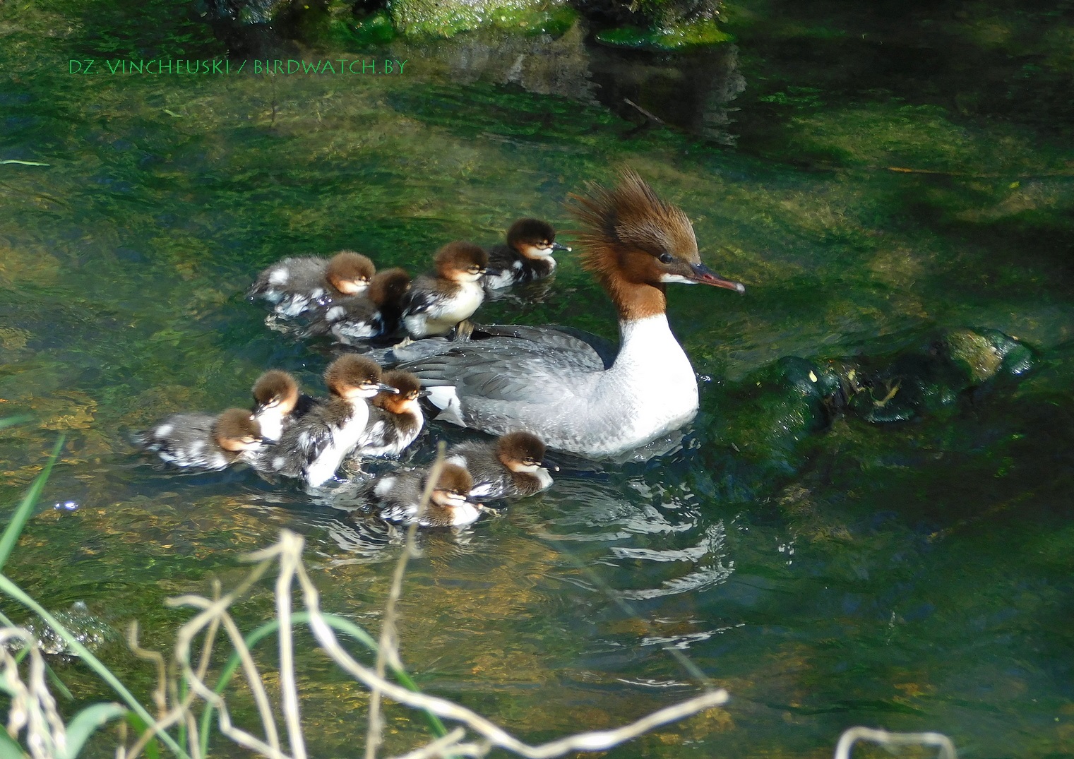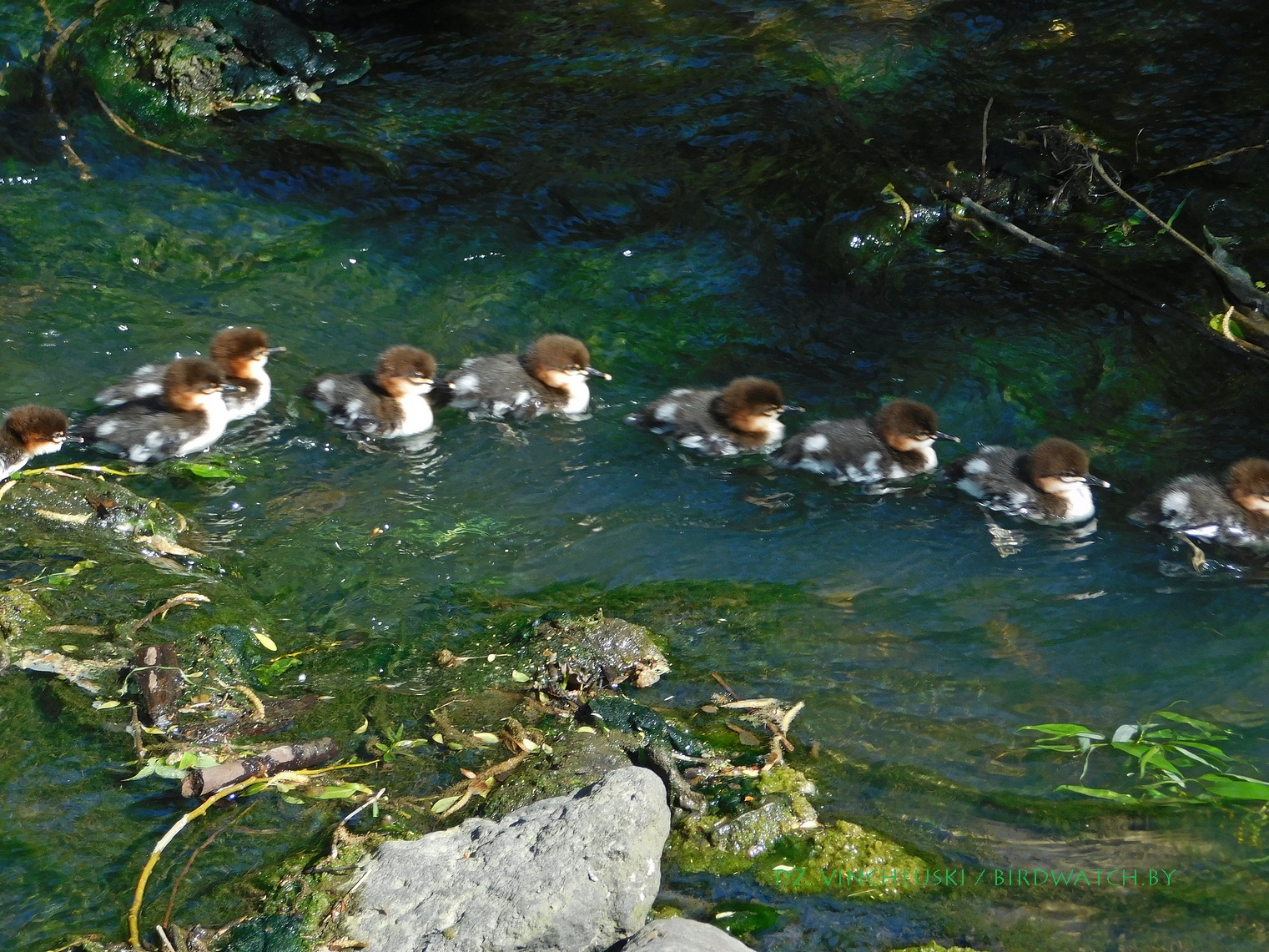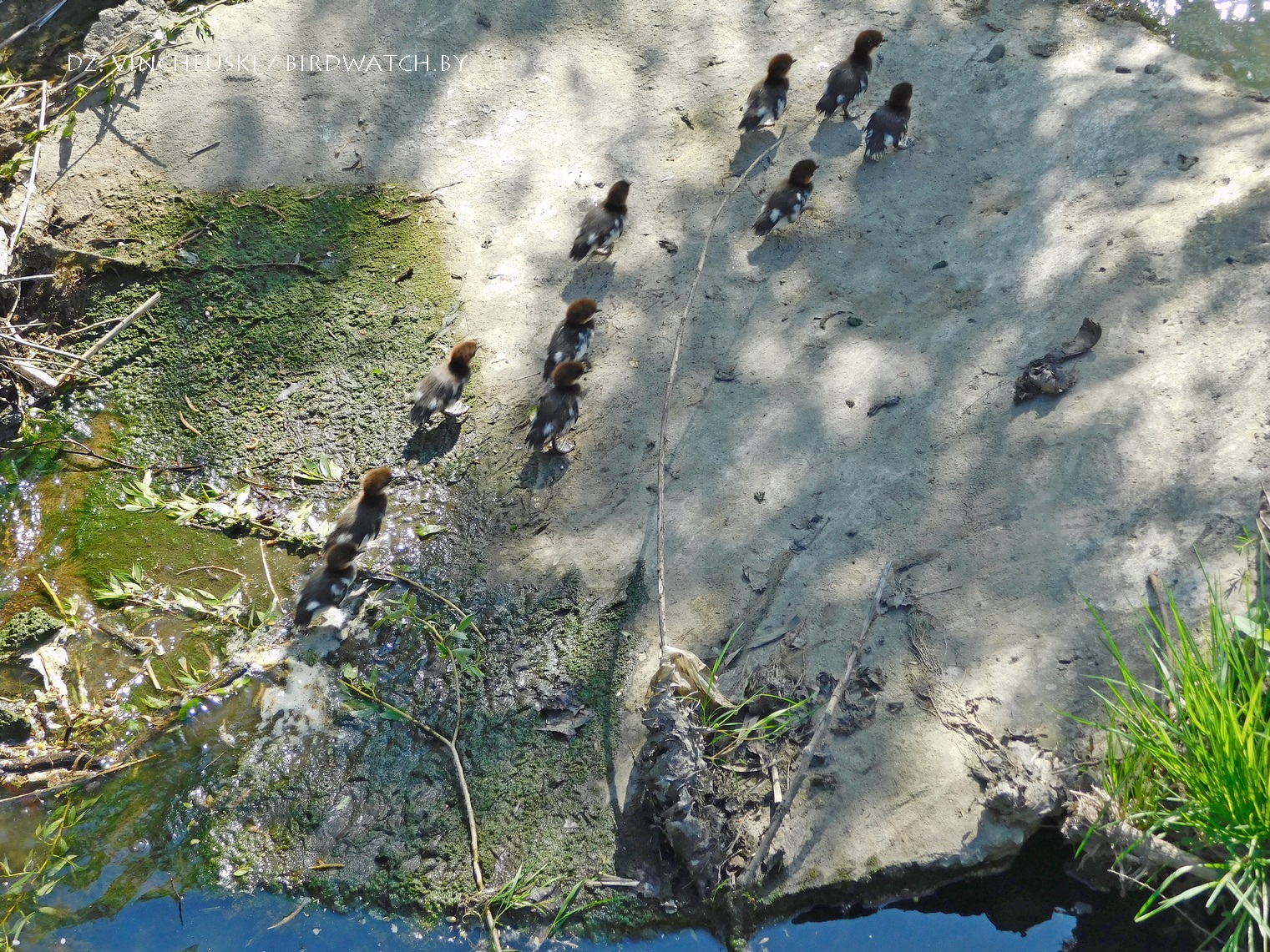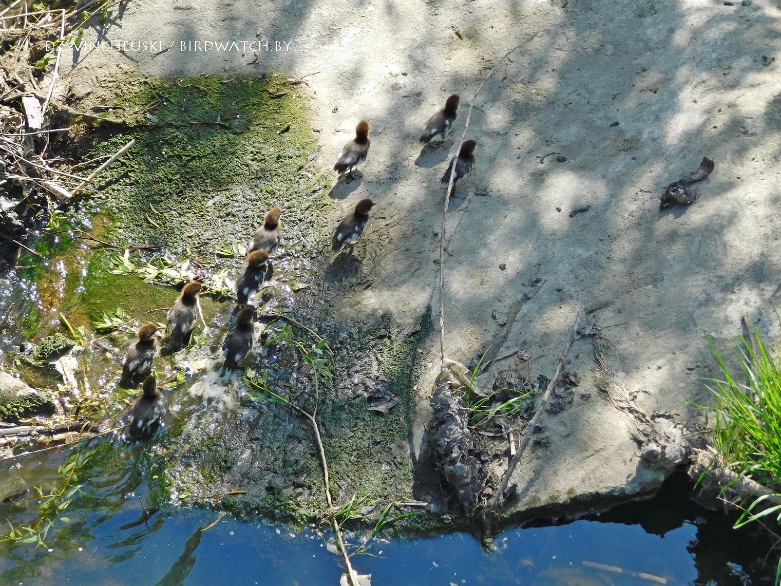 У той дзень я не спяшаючыся йшоў да норкі зімародка на Гараднічанцы, перайшоў праз мосцік на іншы бераг рачулкі і калі затрымаўся там каля высокага дуба, пачуў з боку рэчкі дзіўнаватае, але выразнае пахрукванне. Варыянты яго паходжання былі толькі два, або бабёр, або... І я чамусьці адразу здагадаўся, што адбываецца як раз тое, што я марыў убачыць! Я кінуўся да рэчкі і хутка знайшоў прагаліну паміж дрэўцамі на беразе. Так і ёсць, гэта самка вялікага савука (Mergus merganser) падганяе сваіх качанят, якія яўна зусім нядаўна вылупіліся і выпрыгнулі за ёй з дупла (або з нары?)!