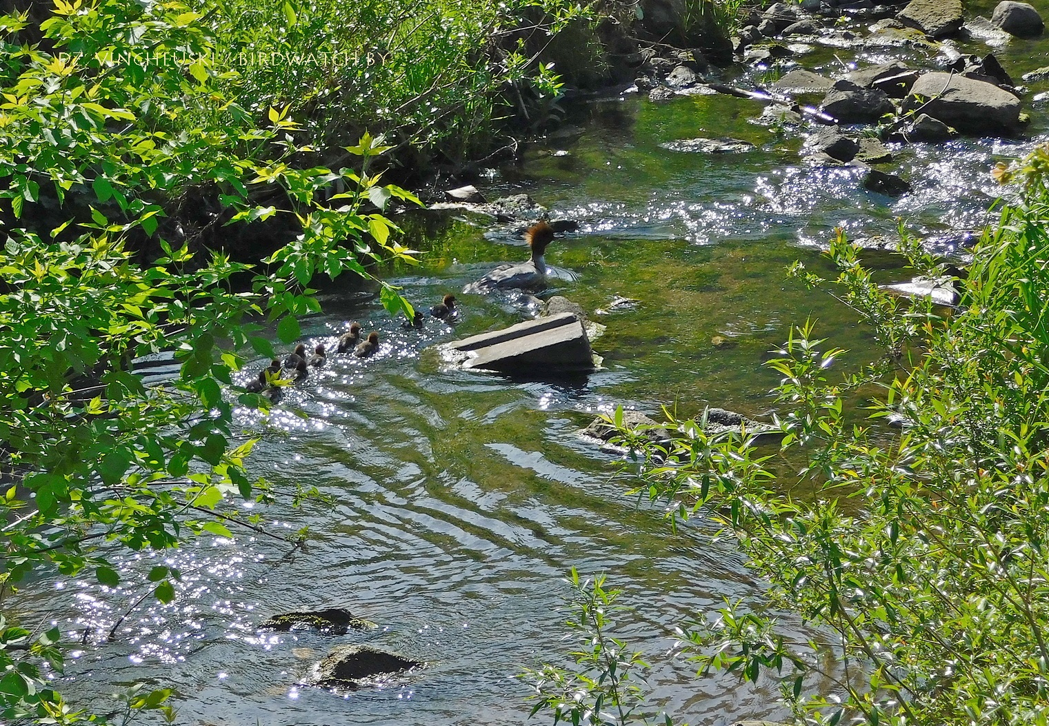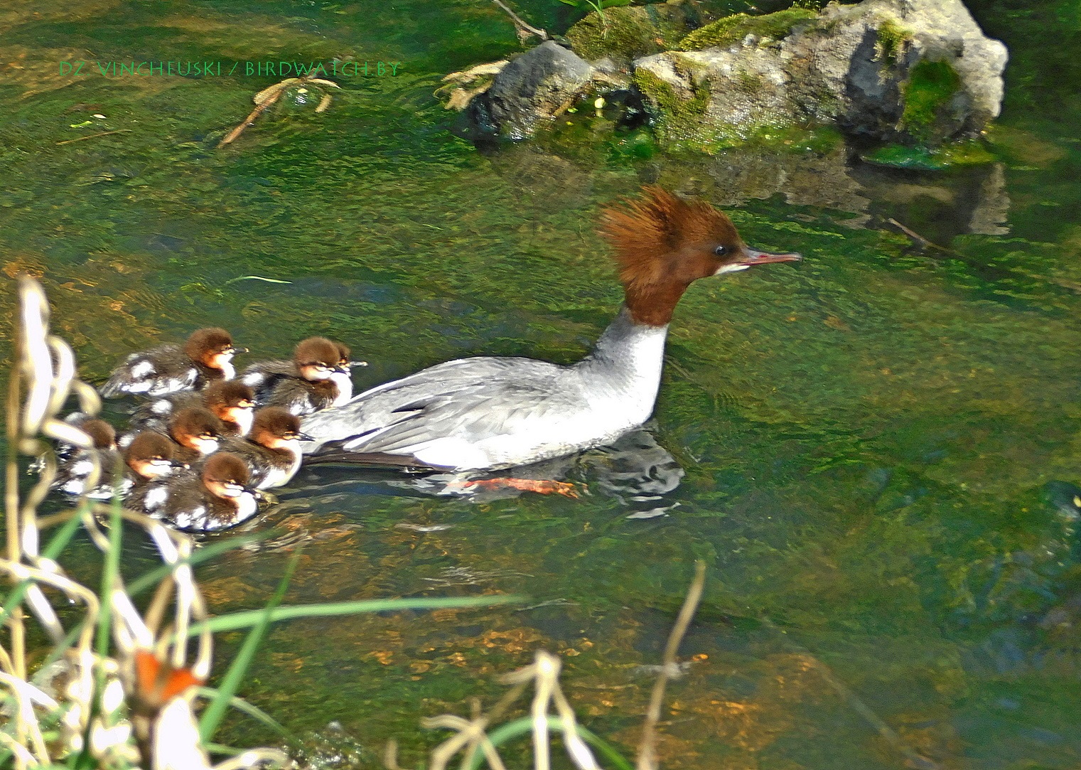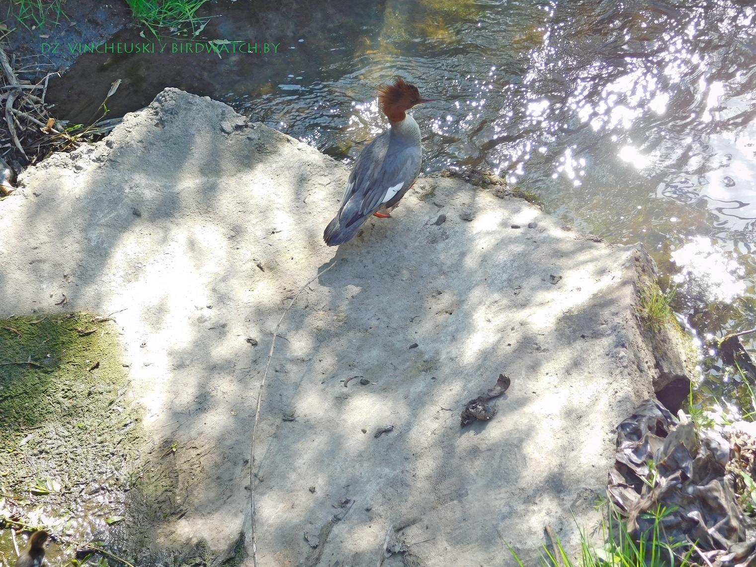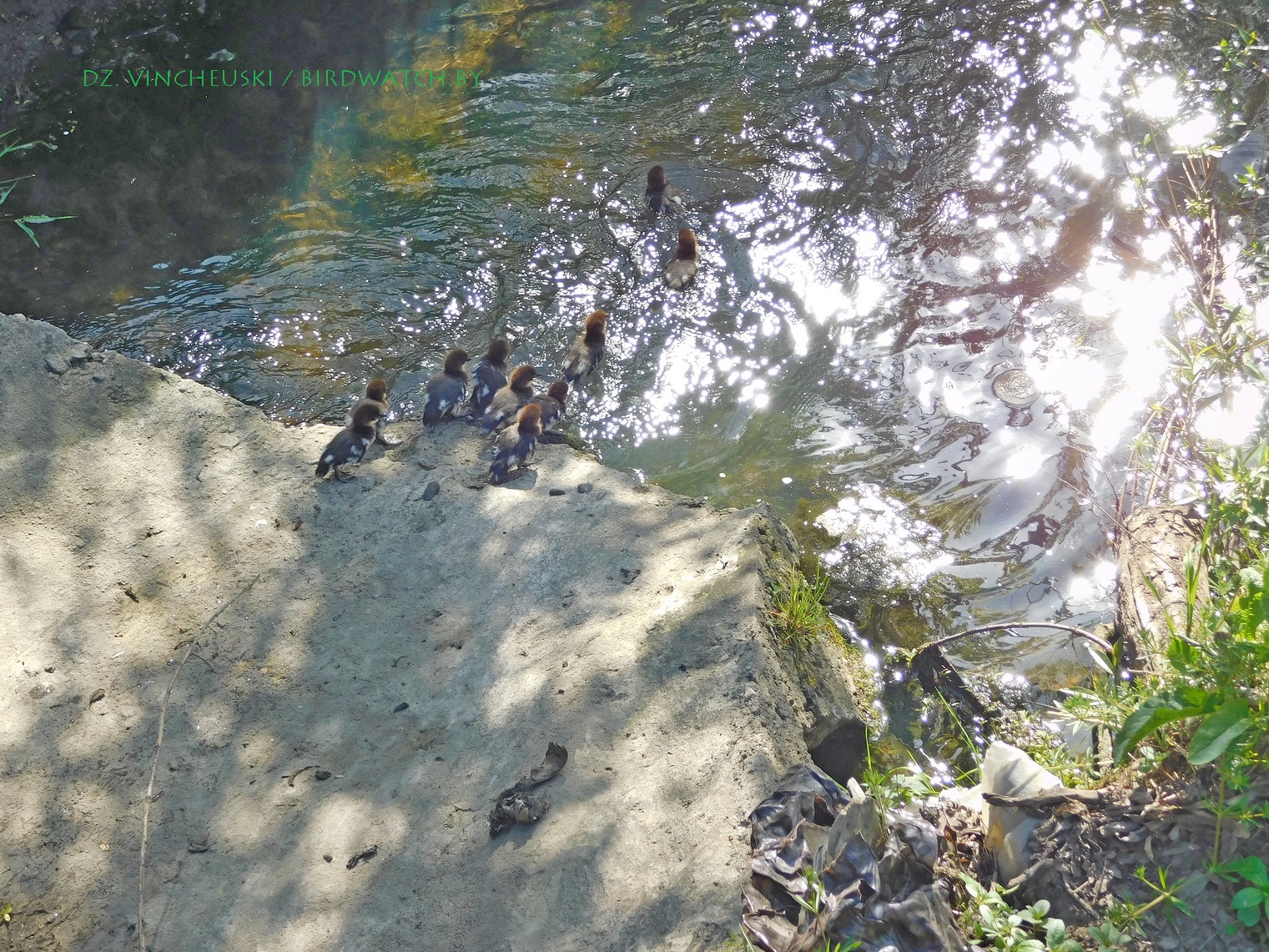 У той дзень я не спяшаючыся йшоў да норкі зімародка на Гараднічанцы, перайшоў праз мосцік на іншы бераг рачулкі і калі затрымаўся там каля высокага дуба, пачуў з боку рэчкі дзіўнаватае, але выразнае пахрукванне. Варыянты яго паходжання былі толькі два, або бабёр, або... І я чамусьці адразу здагадаўся, што адбываецца як раз тое, што я марыў убачыць! Я кінуўся да рэчкі і хутка знайшоў прагаліну паміж дрэўцамі на беразе. Так і ёсць, гэта самка вялікага савука (Mergus merganser) падганяе сваіх качанят, якія яўна зусім нядаўна вылупіліся і выпрыгнулі за ёй з дупла (або з нары?)!