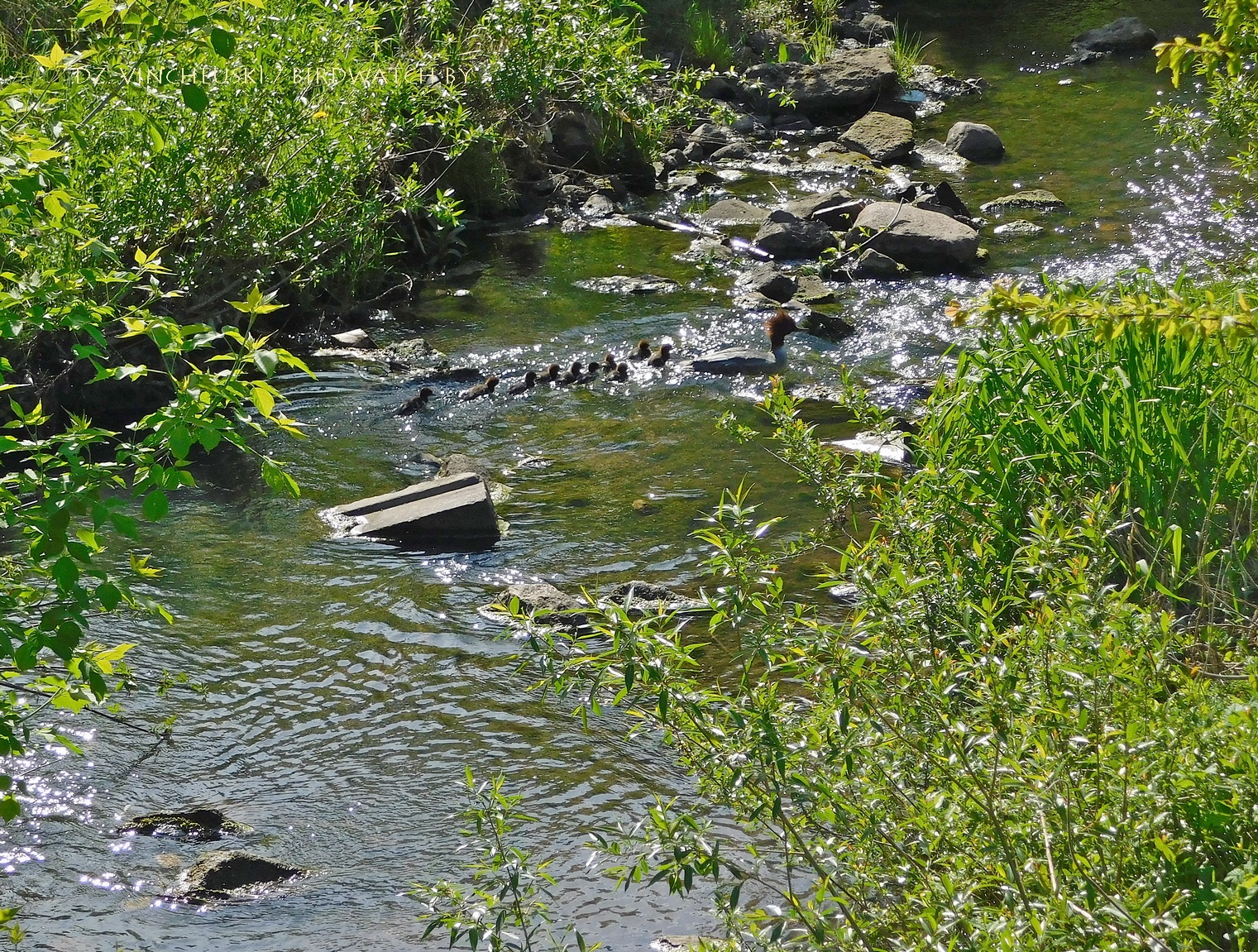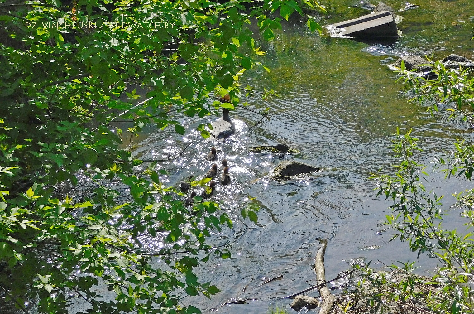 Я пабег на мосцік, які перайшоў зусім нядаўна і з яго паспеў зрабіць яшчэ некалькі кадраў. За ім ляжаў шырокі і амаль плоскі абломак бетоннай трубы вялікага дыяметру на які прыйшлося посуху перабегчы спачатку самцы, а потым і качанятам каб плыць далей. І хаця тут адлегласць паміж мамай і малымі стала найбольшай - некалькі метраў, яна зусім не запавольніла сваё плаванне і качаняты, на дзіва для мяне, хутка яе дагналі па вадзе.