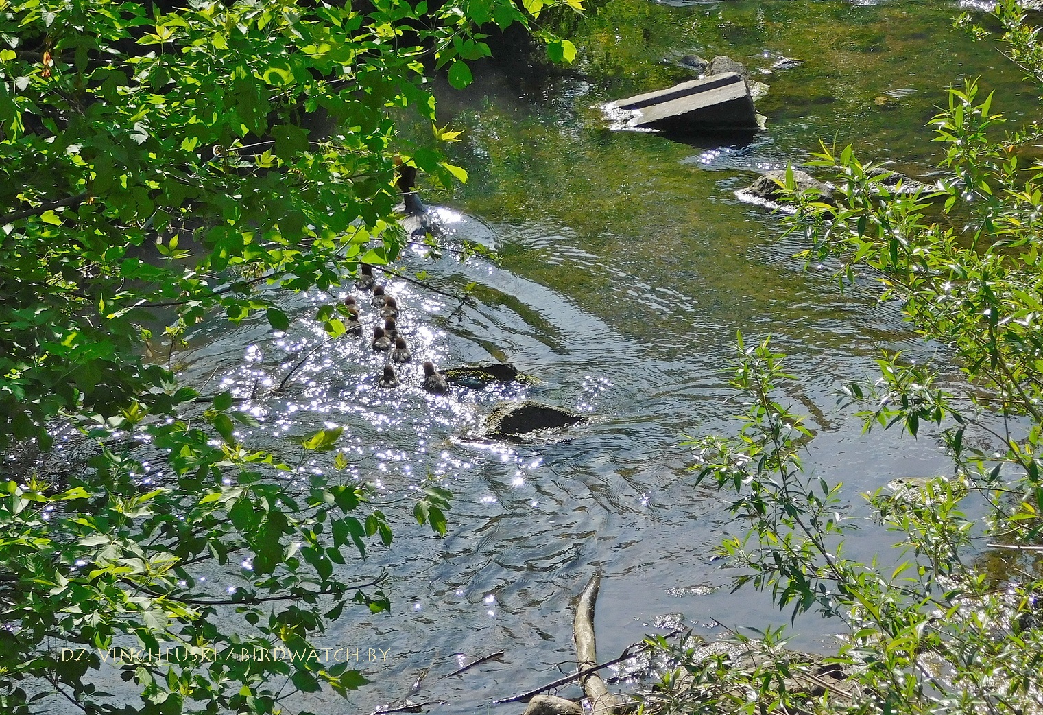 Ну можа не зусім падганяе, а выразнымі гукамі дае ведаць, што яна наперадзе і нават калі не бачыш маму, плыві на гэты гук і яна там будзе. Плынь у Гараднічанкі розная, і там дзе яна запавольваецца і адпаведна запавольвалася самка, птушанятаў амаль заносіла вадой на яе спіну. Але ўтрымацца там яны не маглі - самка спяшалася даплыць да Нёмана, малыя скаталіся са спіны ў ваду і ўся сям'я з 10 малымі вялікімі савукамі пранеслася міма мяне.