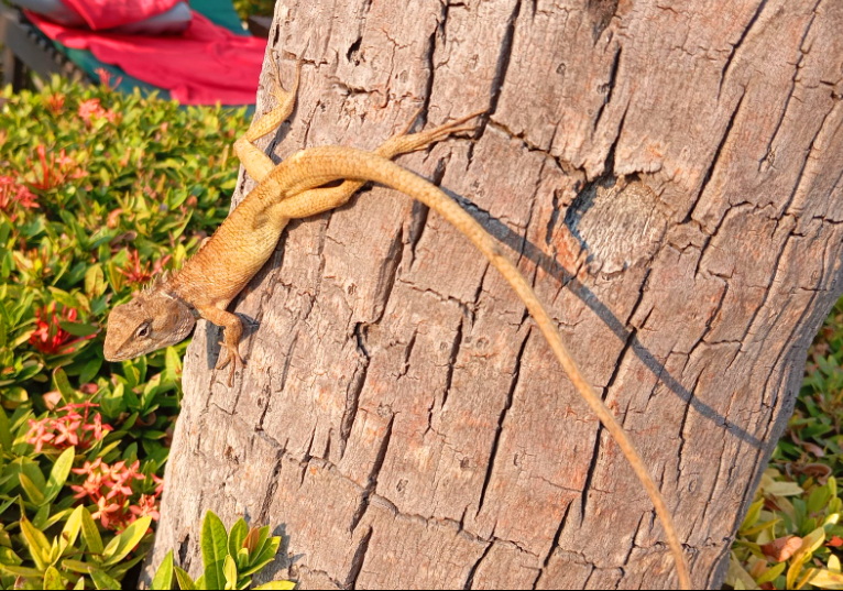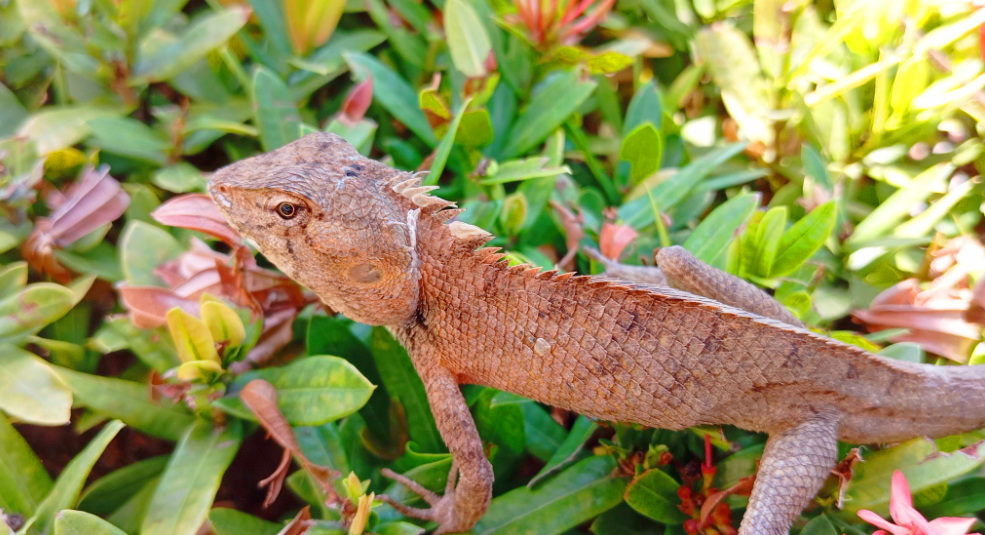 25.01.2026 г. ТАЙЛАНД. г. Паттайя. Отель Asia Pattaya 4*. Ящерица-Восточный садововый калот (Calotes versicolor). Ящерицы облюбовали кустарнички около бассейна. Греются на солнышке, и внимательно наблюдают за плавающими... Автор - Владимир Пенькевич.