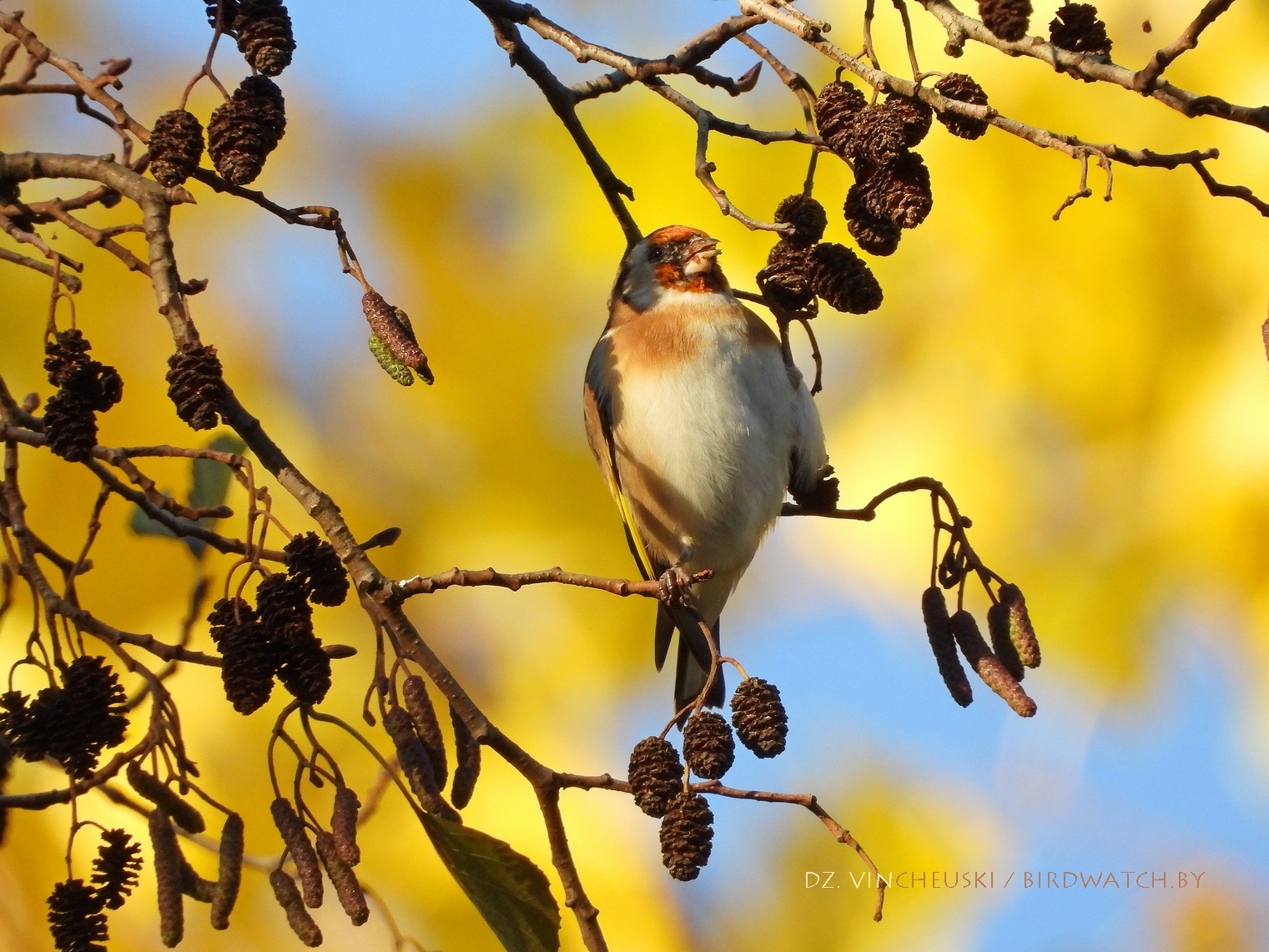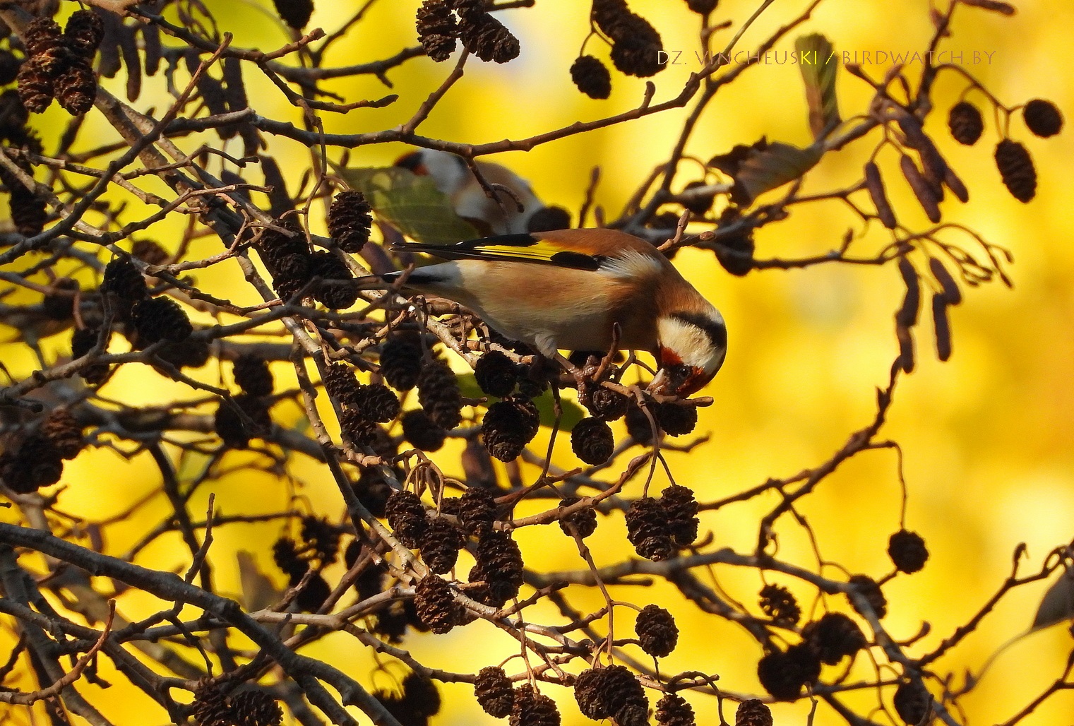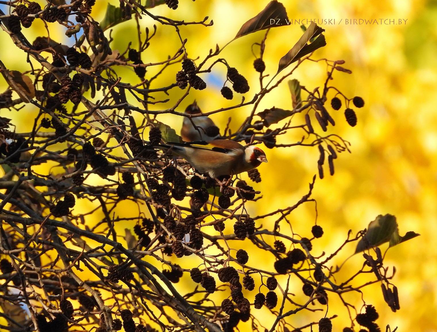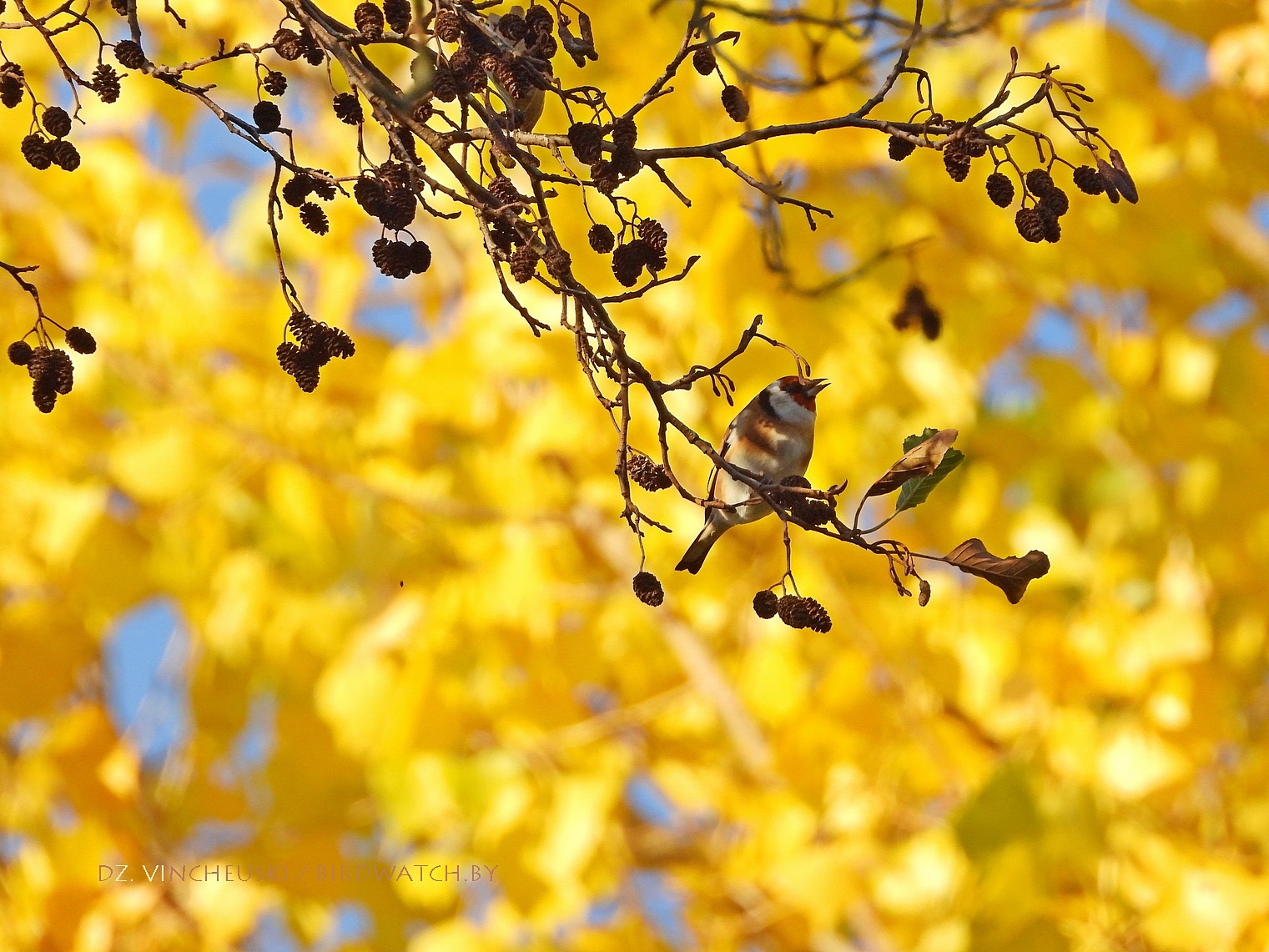 Не ведаю дакладна што - хутчэй за ўсё яркі, сонечны дзень - прымусіла мяне пайсці пашукаць птушак бліжэй да вечара. Для гэтага я перайшоў па масту на другі бераг і нават не паспеў перайсці мосцік праз ручаіну, якая самастойна ўпадае ў Нёман у самым пачатку скверыка, як зверху пачуў ціхія, але выразныя пазыўкі чорнагаловых шчыгелаў ().