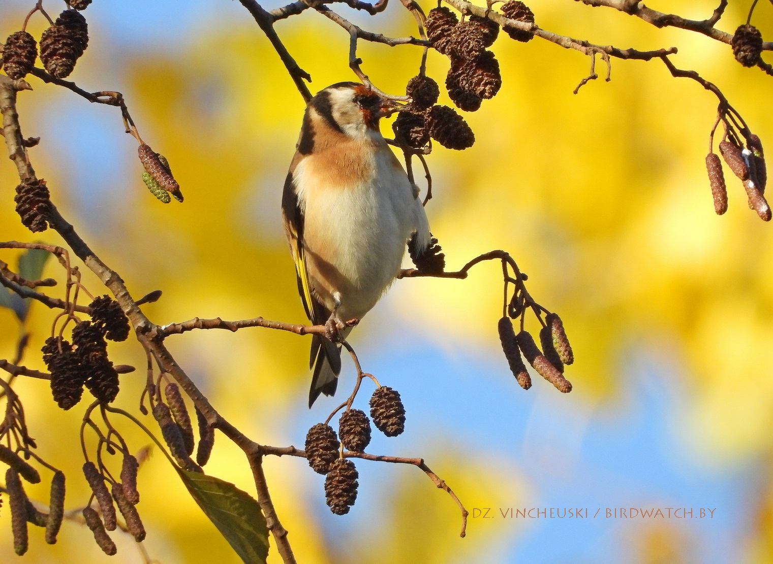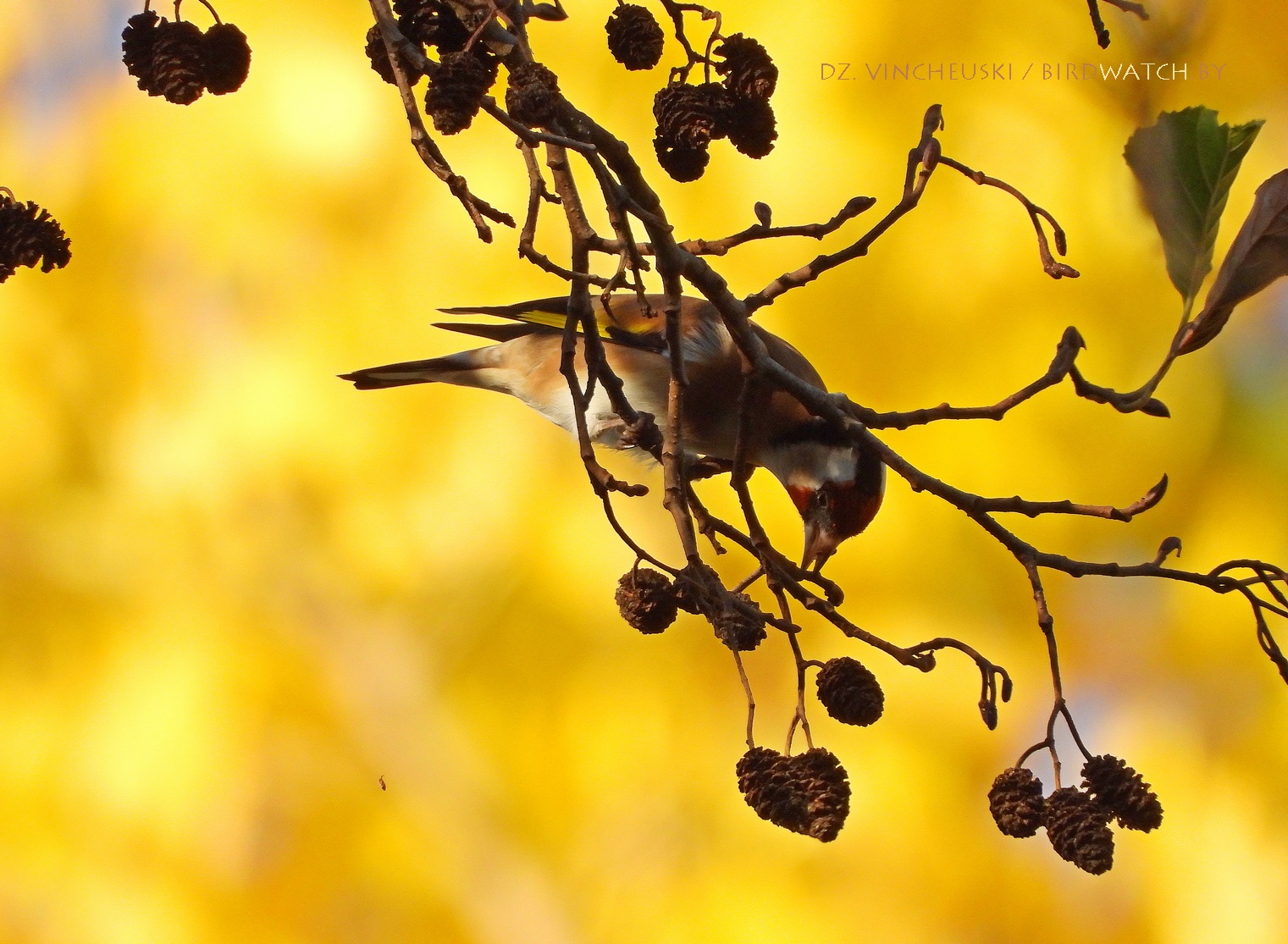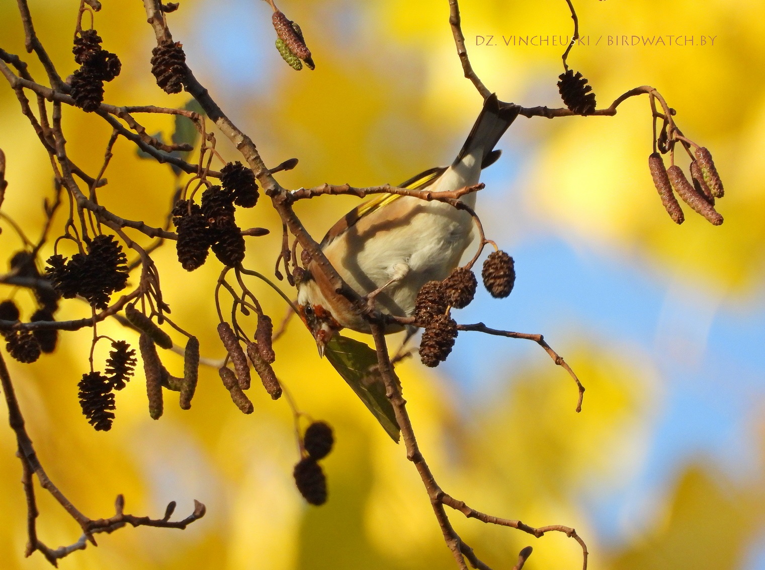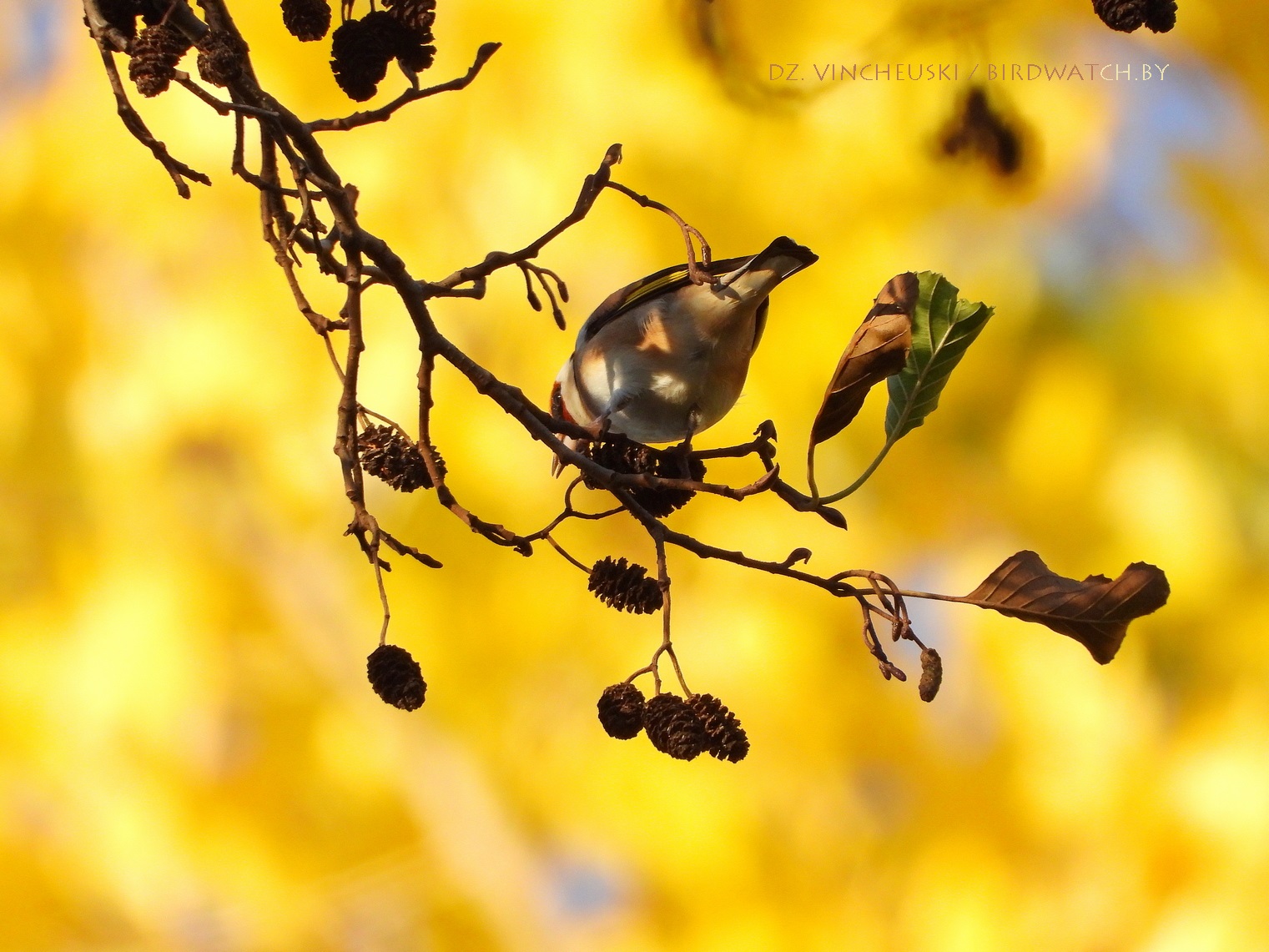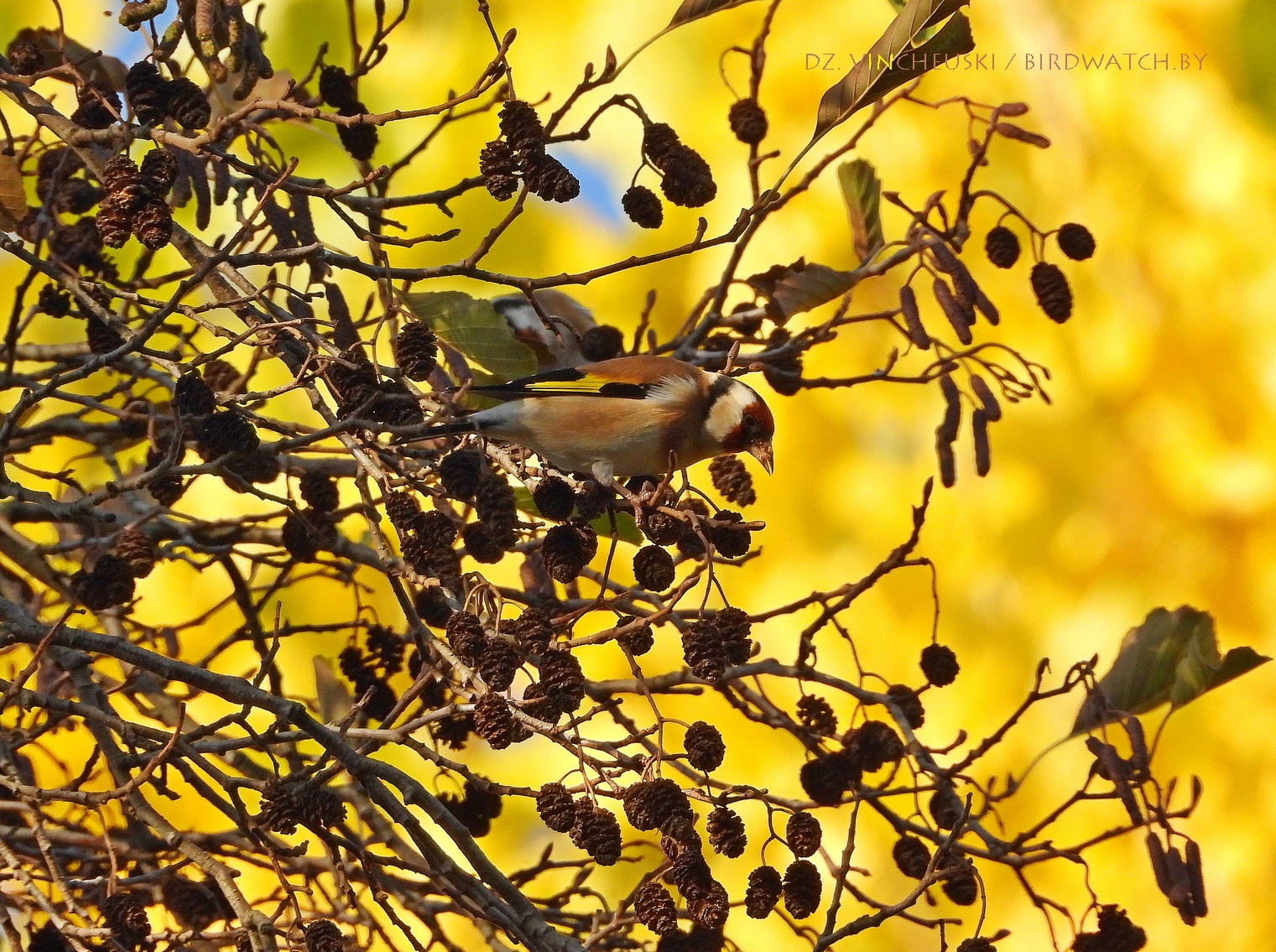 Не ведаю дакладна што - хутчэй за ўсё яркі, сонечны дзень - прымусіла мяне пайсці пашукаць птушак бліжэй да вечара. Для гэтага я перайшоў па масту на другі бераг і нават не паспеў перайсці мосцік праз ручаіну, якая самастойна ўпадае ў Нёман у самым пачатку скверыка, як зверху пачуў ціхія, але выразныя пазыўкі чорнагаловых шчыгелаў ().