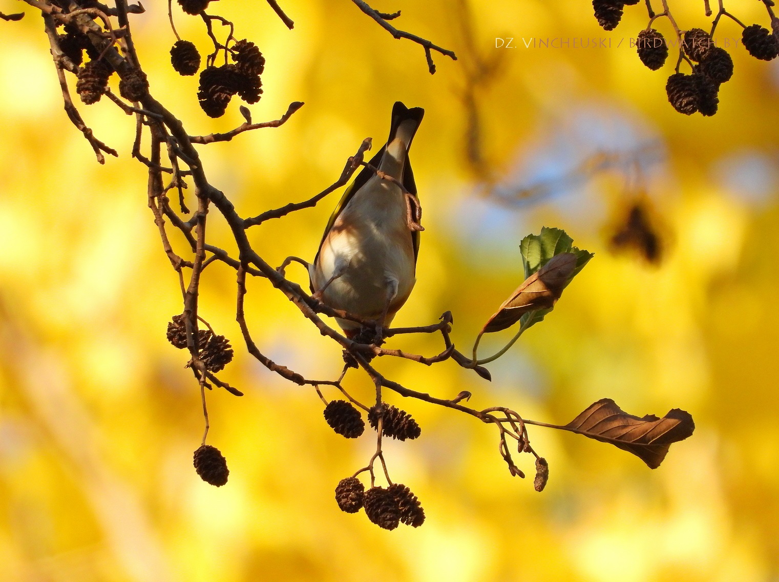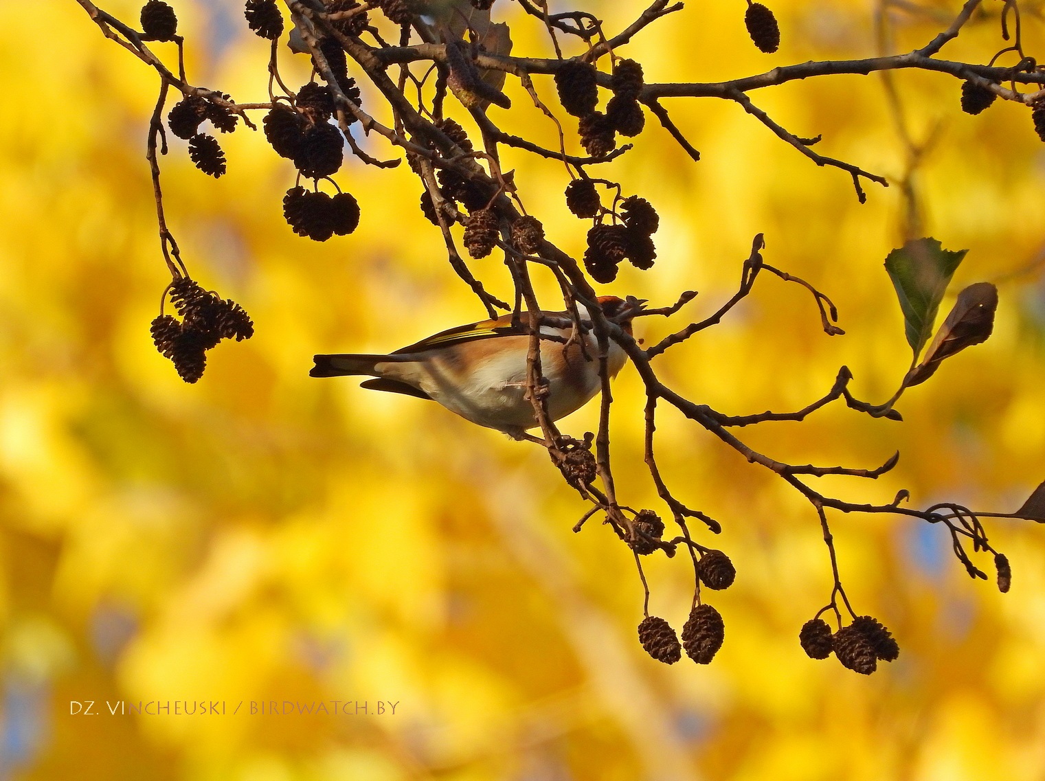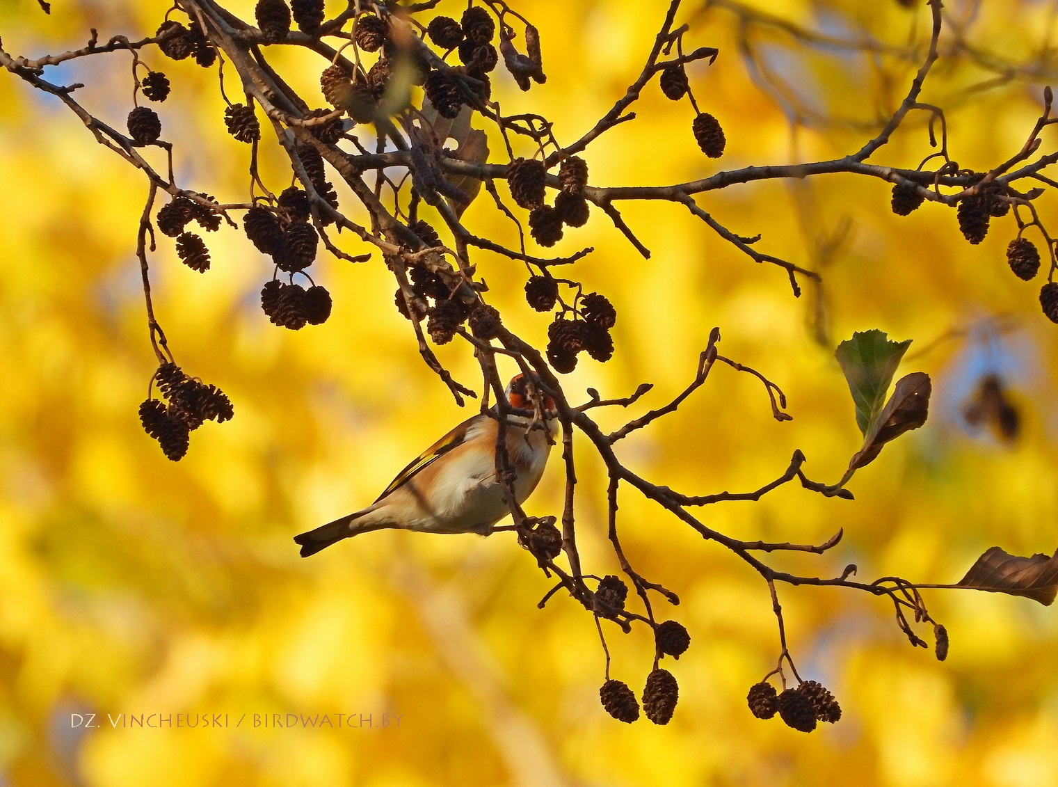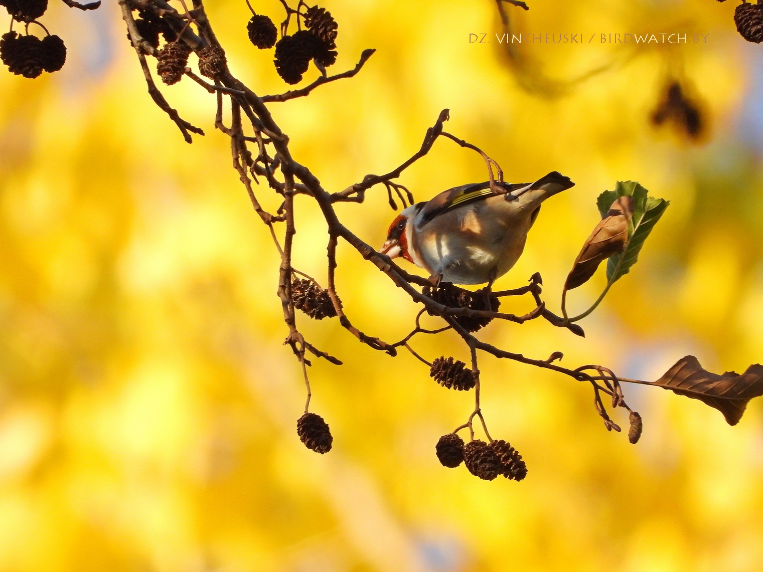 Не ведаю дакладна што - хутчэй за ўсё яркі, сонечны дзень - прымусіла мяне пайсці пашукаць птушак бліжэй да вечара. Для гэтага я перайшоў па масту на другі бераг і нават не паспеў перайсці мосцік праз ручаіну, якая самастойна ўпадае ў Нёман у самым пачатку скверыка, як зверху пачуў ціхія, але выразныя пазыўкі чорнагаловых шчыгелаў ().