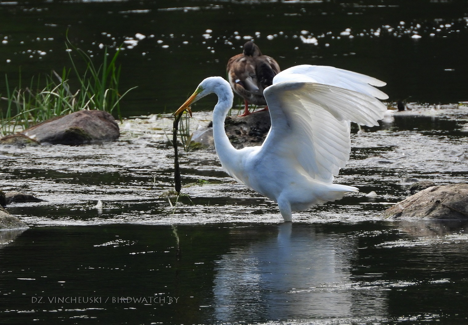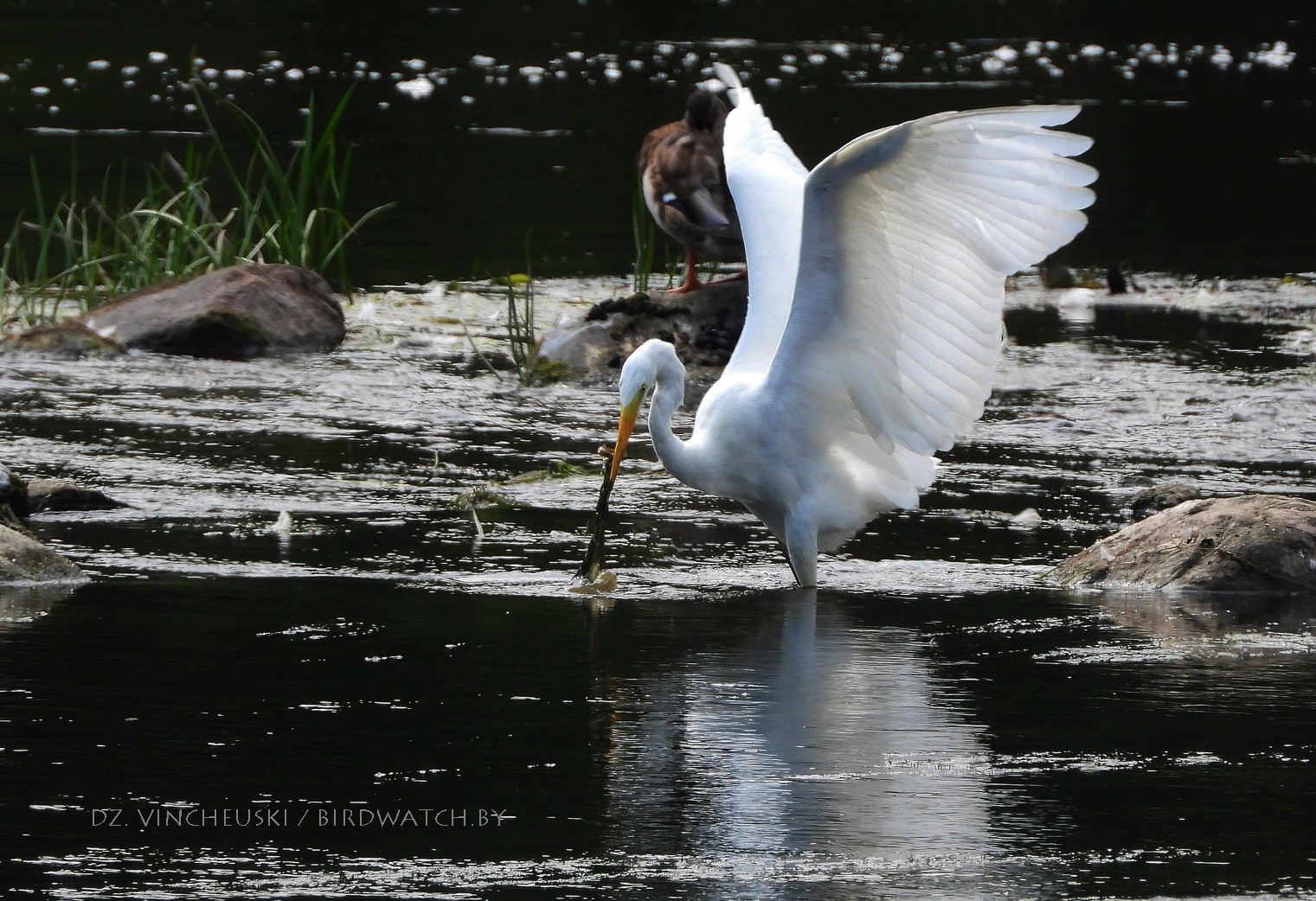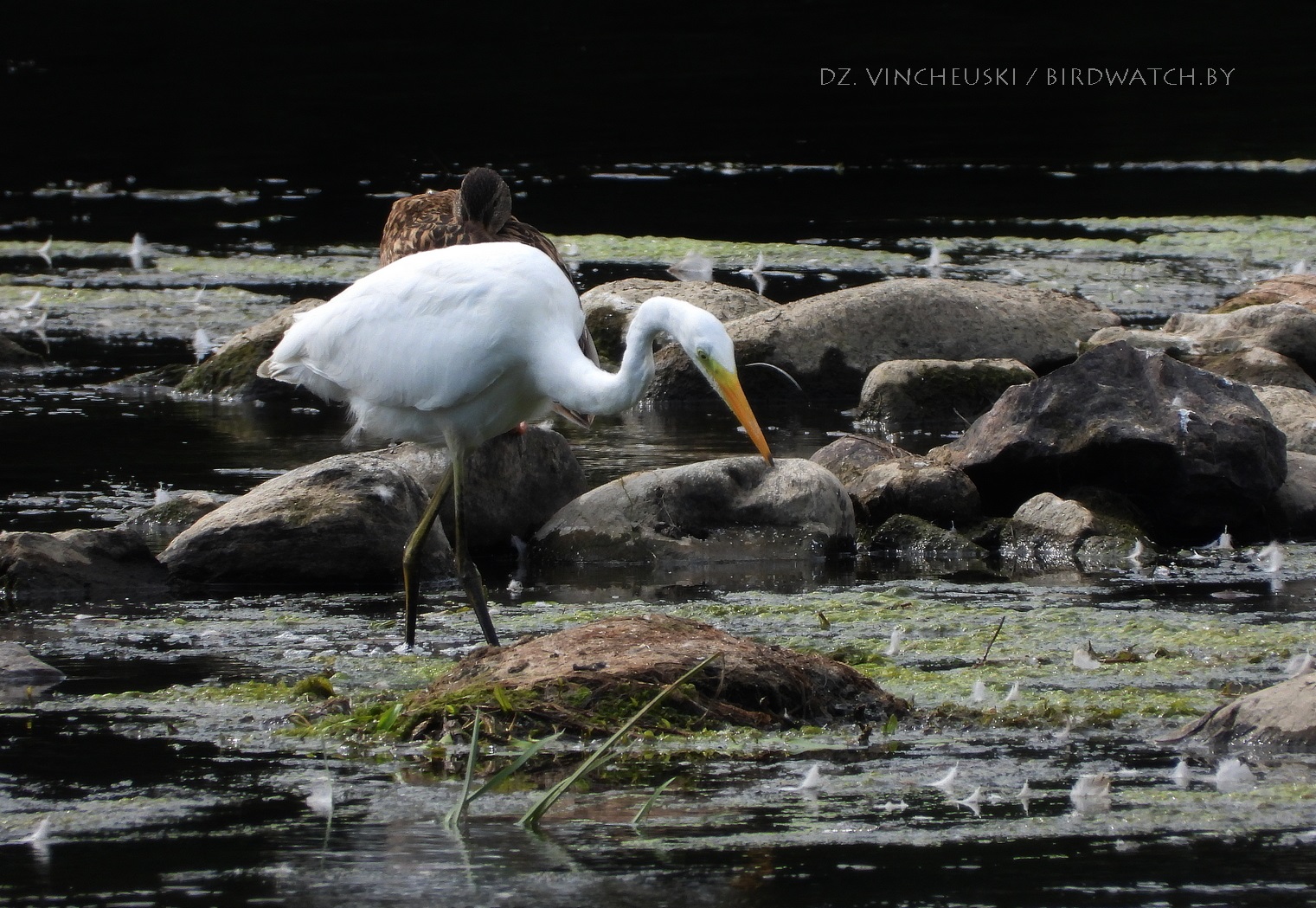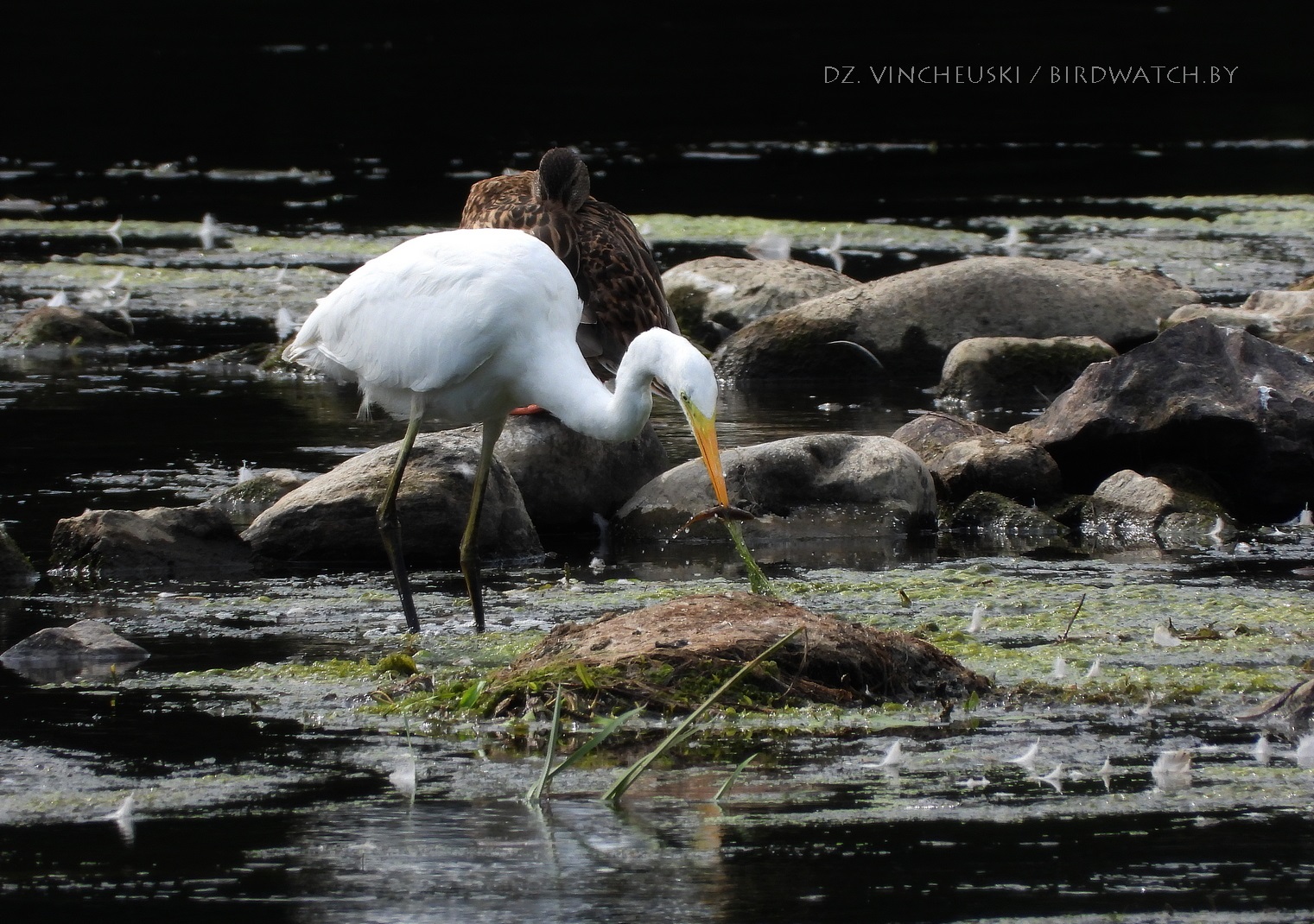 Так было і ў гэты раз ля вострава на Нёмане. Пасля таго, як вялікая белая чапля прагаладалася, яна ўжо з валуна, на якім адпачывала, пачала ўзірацца ў ваду перад сабой і хаця спачaтку нікога там злавіць не атрымалася, далей усё пайшло хутчэй. І першага злоўленага разам з пукам воднай расліннасці пячкура (Gobio gobio) не выратавала яго камуфляжная афарбоўка і невялікія памеры, як і наступнага за ім уюна (Misgurnus fossilis). На дзве паспяховыя атакі чаплі спатрэбіліся ўсяго 15 хвілін. А ўсё таму, што выдатны агляд зверху дазваляе ёй ўбачыць рухі і перамяшчэнні нават выдатна замаскаваных ахвяраў.
