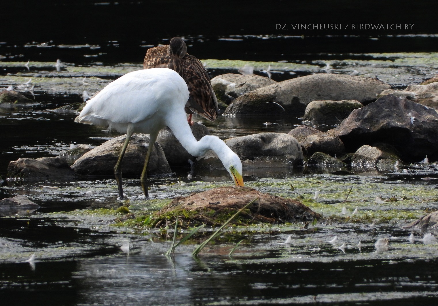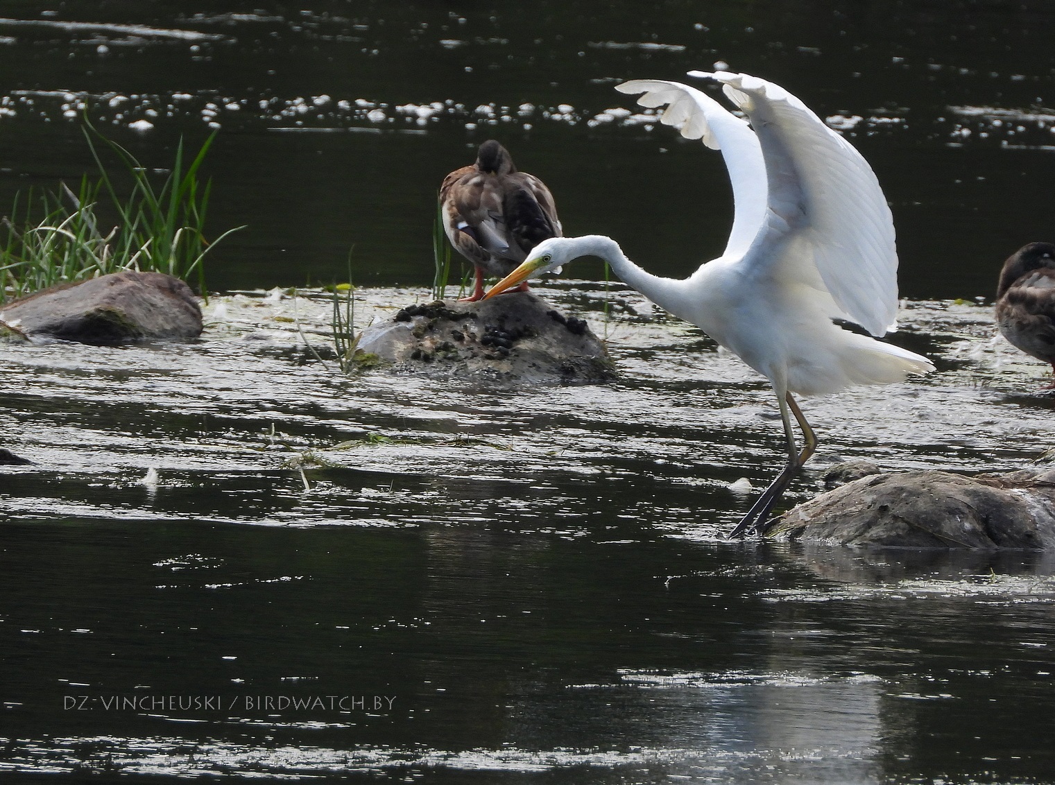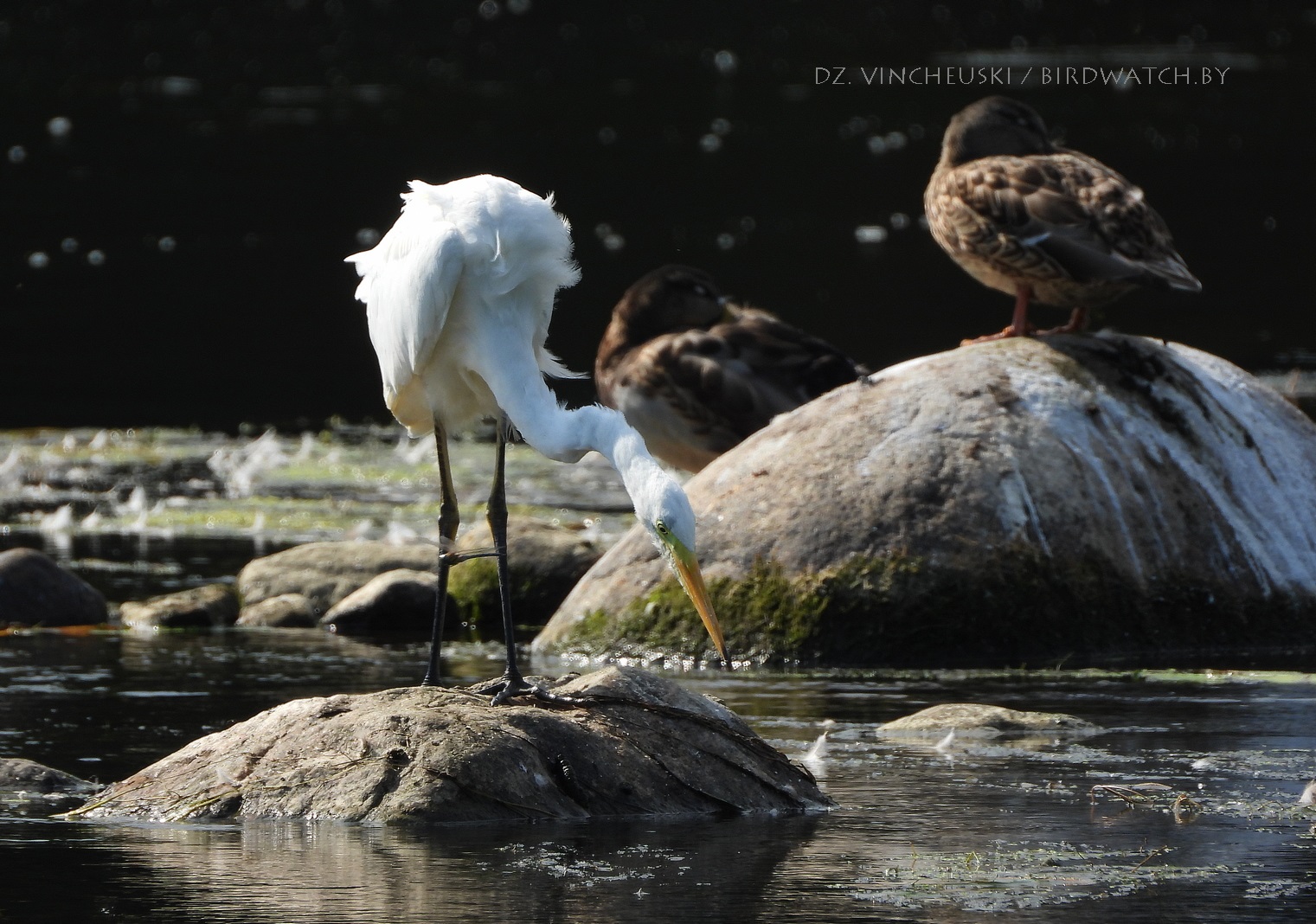 Так было і ў гэты раз ля вострава на Нёмане. Пасля таго, як вялікая белая чапля прагаладалася, яна ўжо з валуна, на якім адпачывала, пачала ўзірацца ў ваду перад сабой і хаця спачaтку нікога там злавіць не атрымалася, далей усё пайшло хутчэй. І першага злоўленага разам з пукам воднай расліннасці пячкура (Gobio gobio) не выратавала яго камуфляжная афарбоўка і невялікія памеры, як і наступнага за ім уюна (Misgurnus fossilis). На дзве паспяховыя атакі чаплі спатрэбіліся ўсяго 15 хвілін. А ўсё таму, што выдатны агляд зверху дазваляе ёй ўбачыць рухі і перамяшчэнні нават выдатна замаскаваных ахвяраў.